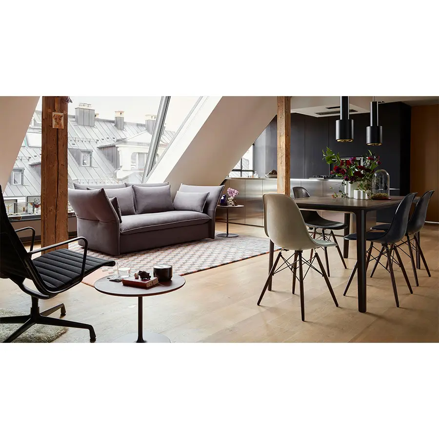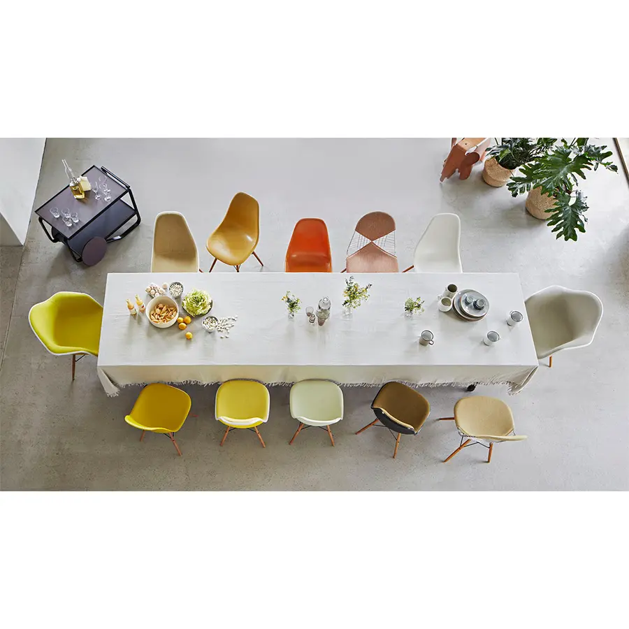 Para la silla Dining Height Side Chair Wood Base (DSW), Charles y Ray Eames combinaron la carcasa de asiento de forma orgánica con una base de madera de cuatro patas. La combinación de plástico y madera confiere a este diseño clásico su atractivo cálido y desenfadado. Las carcasas de asiento pueden completarse con cojines o acolchado completo en una amplia selección de colores de la tela, lo que permite realizar diversas configuraciones individuales.