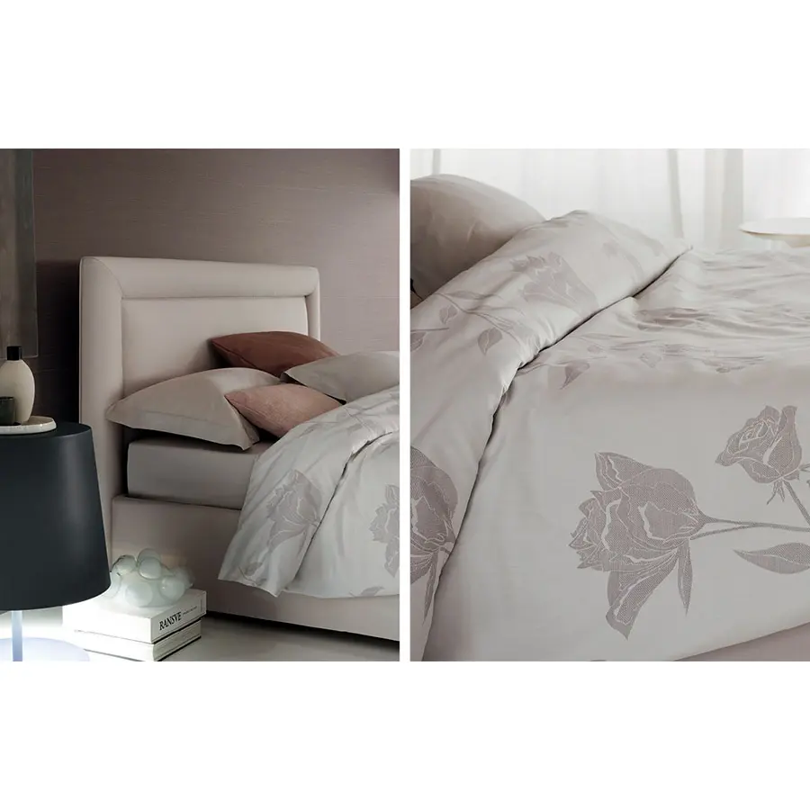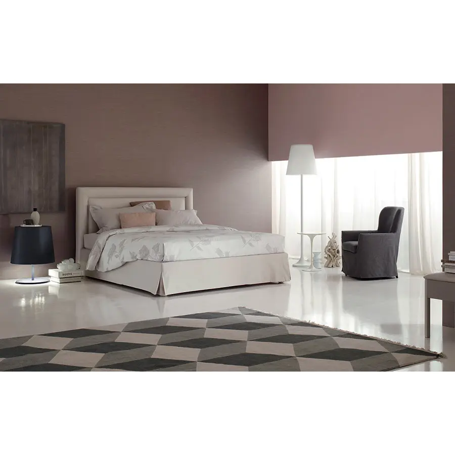 Elegante y refinada cama matrimonial disponible con base de muelles Leonardo, base fija h 25 cm, base contenedor, y con somieres de movimiento eléctrico. Cabecera acolchada y como la base, forrada en tejido, piel o Ecopelle completamente desenfundables gracias a los prácticos cierres de velcro.