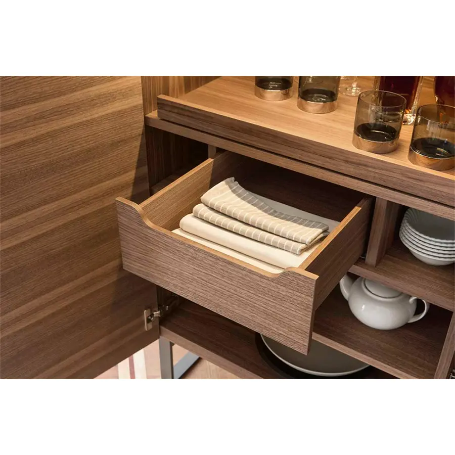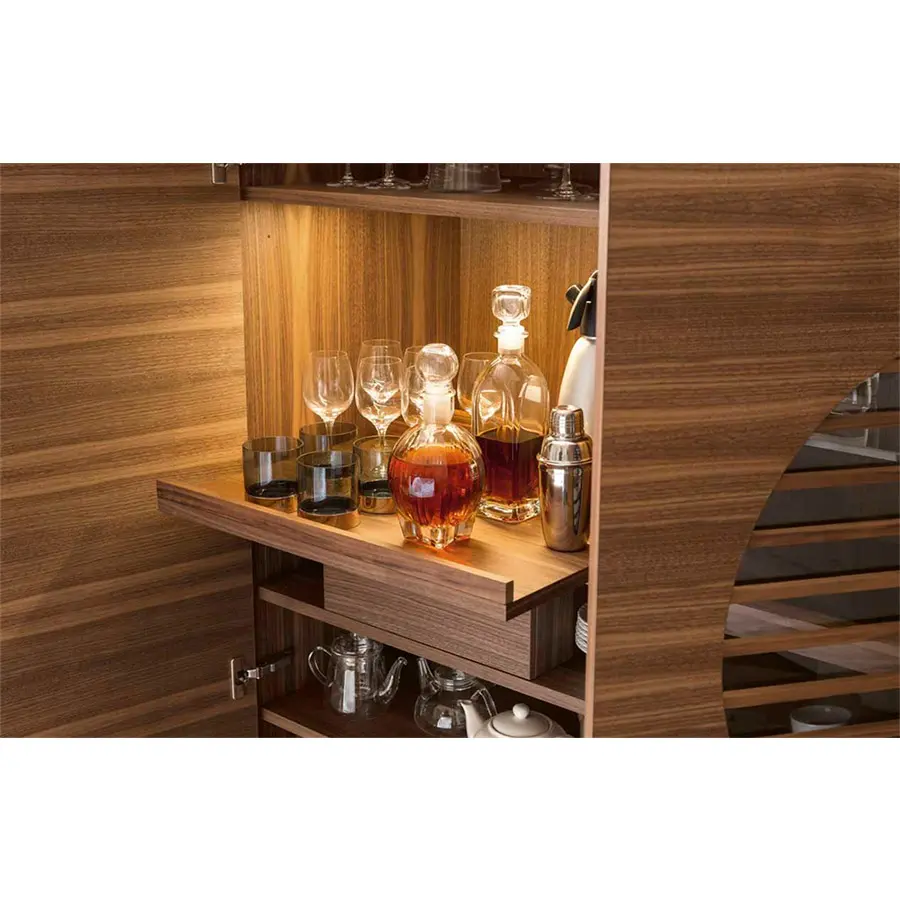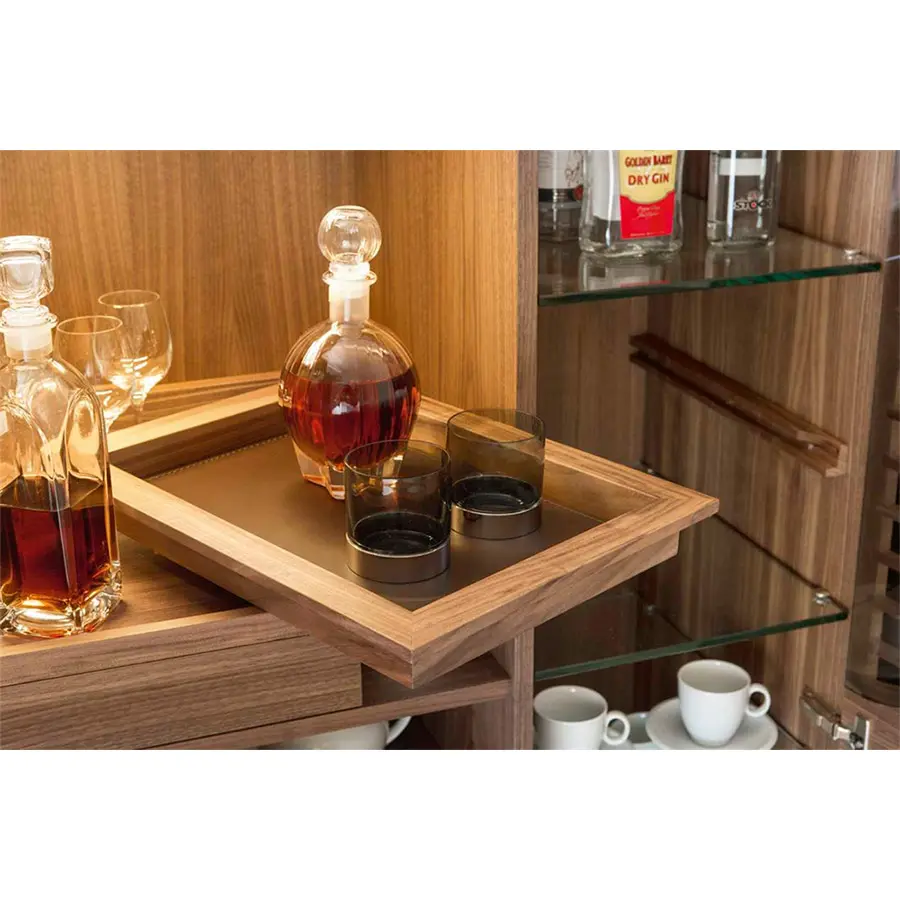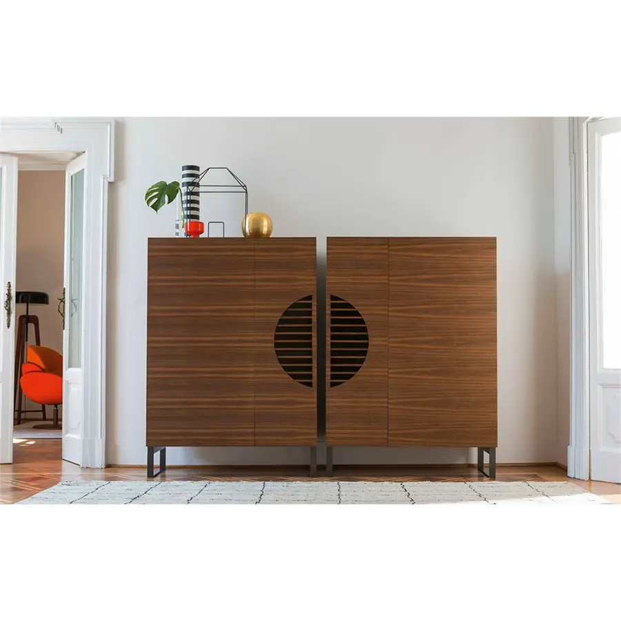 Mueble bar de dos puertas en nogal canaletta con patas de metal. En el interior hay un compartimiento iluminado con luz de LED con tapa extraíble de madera, cajón, bandeja de madera revestida de cuero, estantes de cristales y de madera. Polifemo está disponible en versión derecha/izquierda, las medidas son 110x52x155H