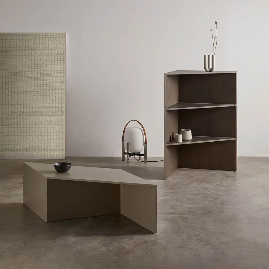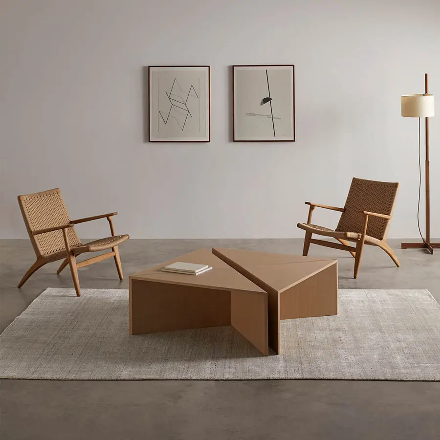 Mesa compuesta por cuatro módulos triangulares que funcionan tanto en conjunto como por separado, cumpliendo la función de mesa de centro, mesas auxiliares o complementos auxiliares para completar las necesidades de cada ambiente.