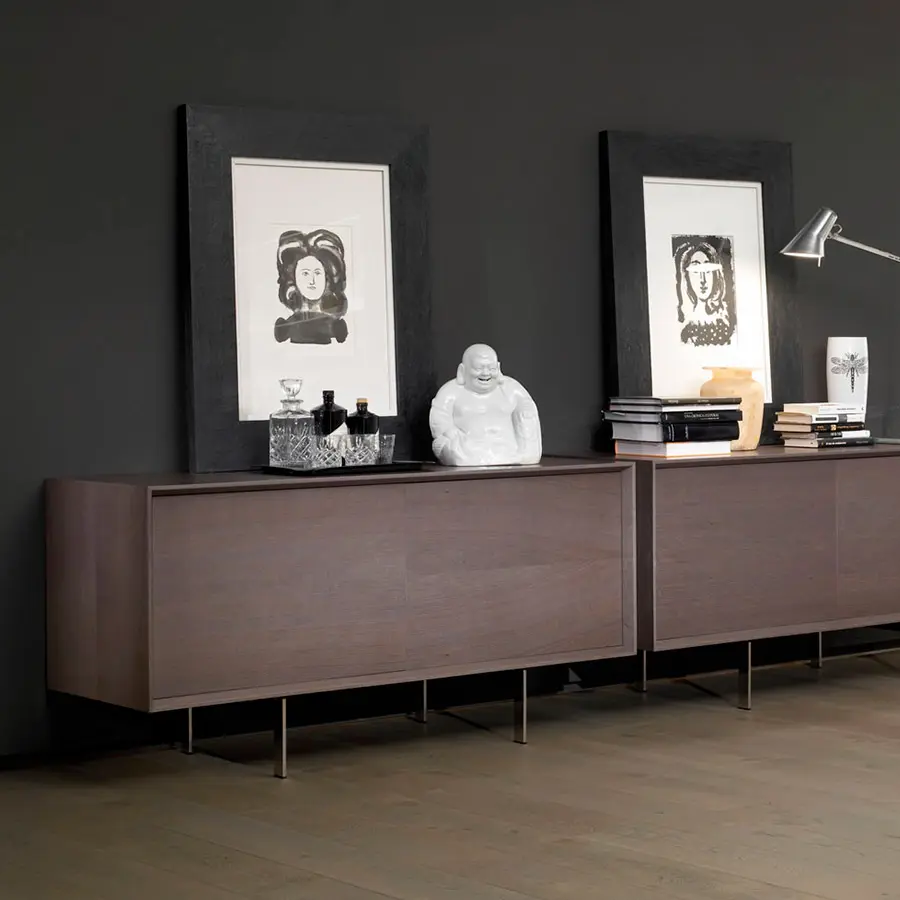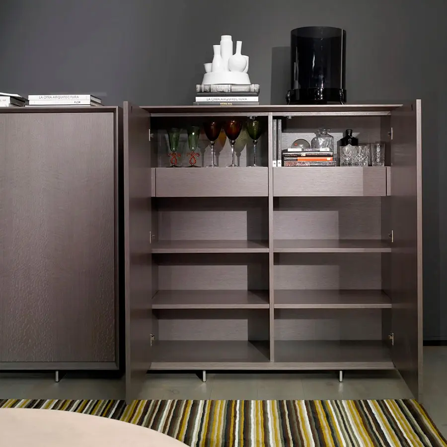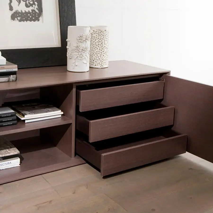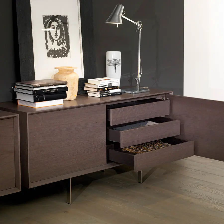 Estructura de madera chapada en roble color a elegir de catálogo o lacada. Interiores de mueble y cajones completamente realizados en chapa de madera original (no melamina). Partes metálicas en acero inoxidable pulido brillo.
