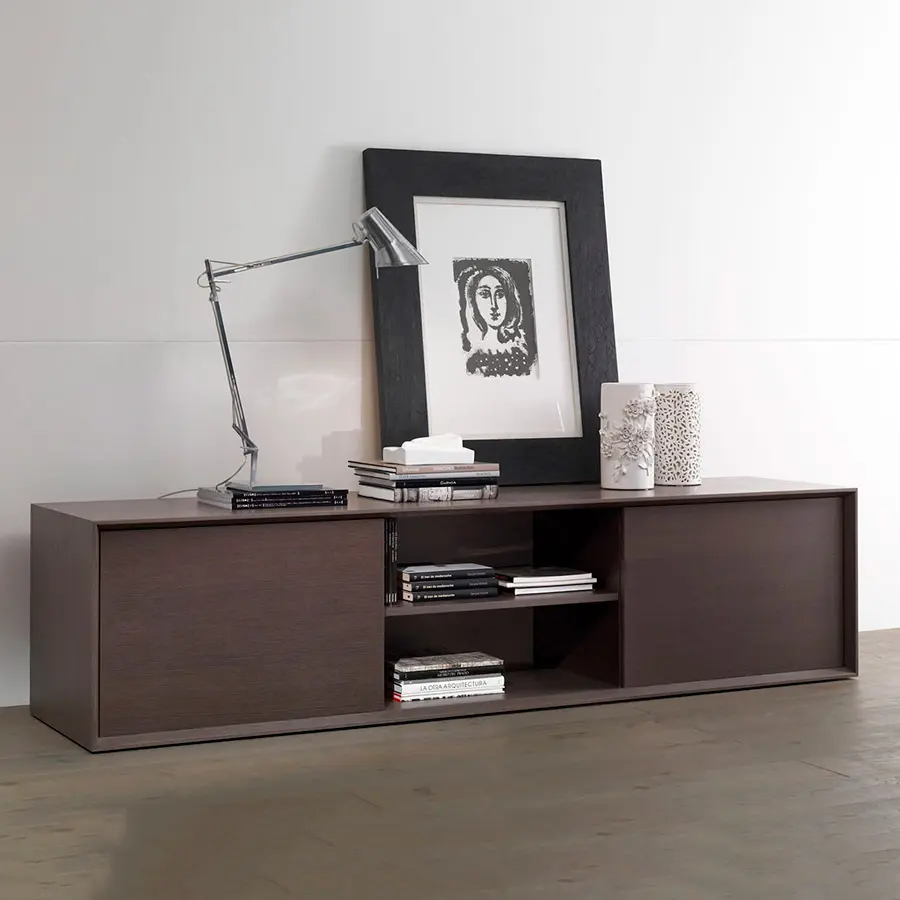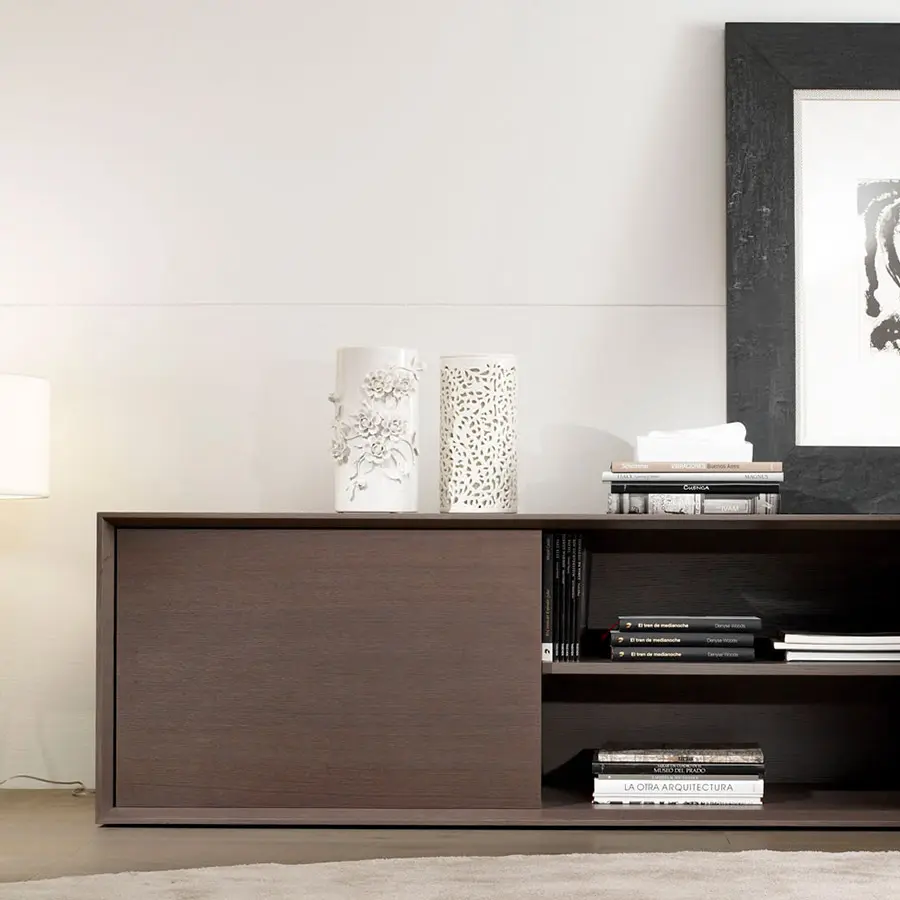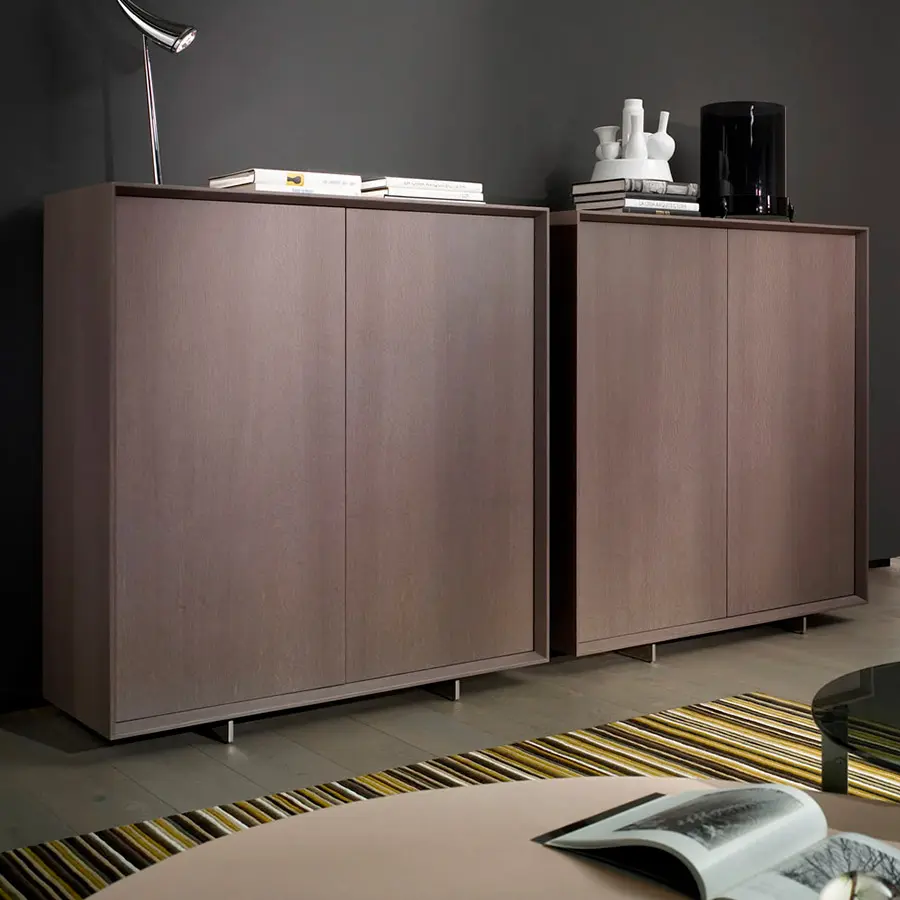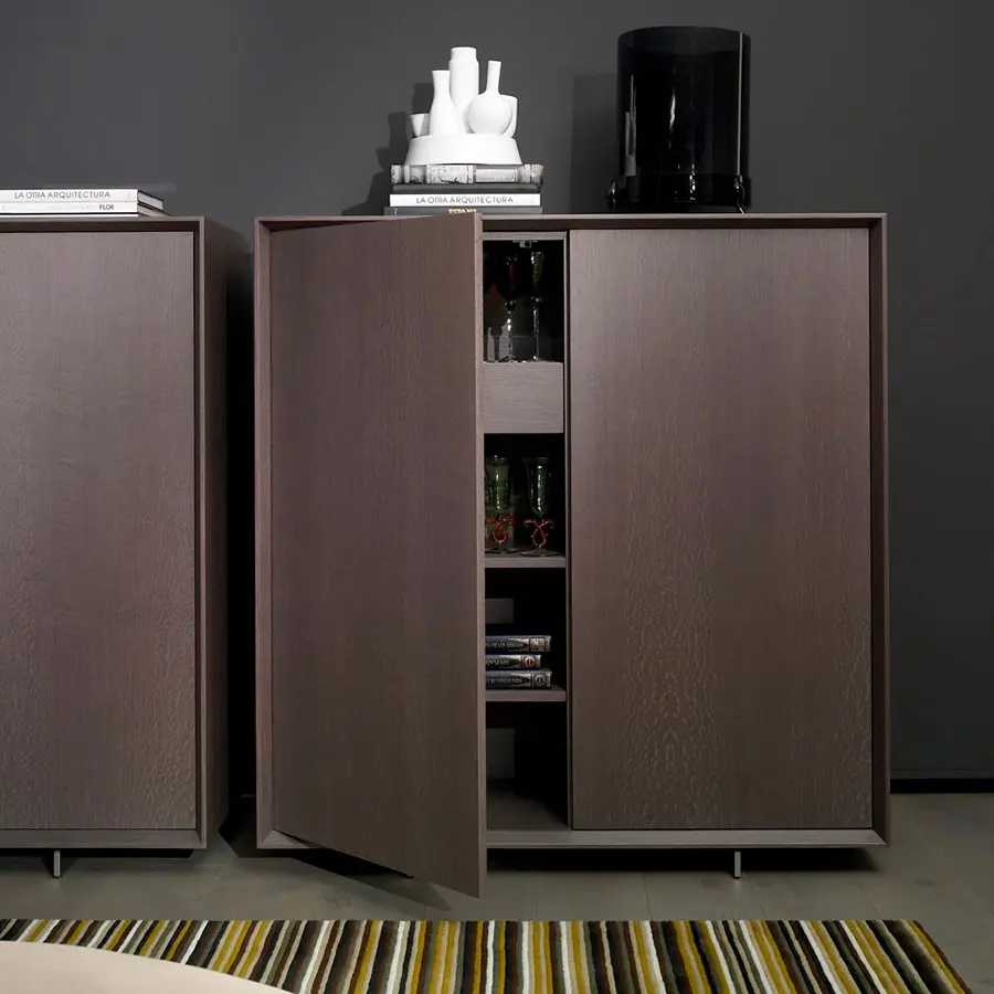 Estructura de madera chapada en roble color a elegir de catálogo o lacada. Interiores de mueble y cajones completamente realizados en chapa de madera original (no melamina). Partes metálicas en acero inoxidable pulido brillo.
