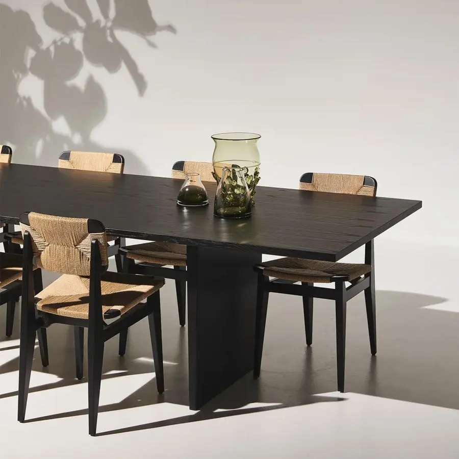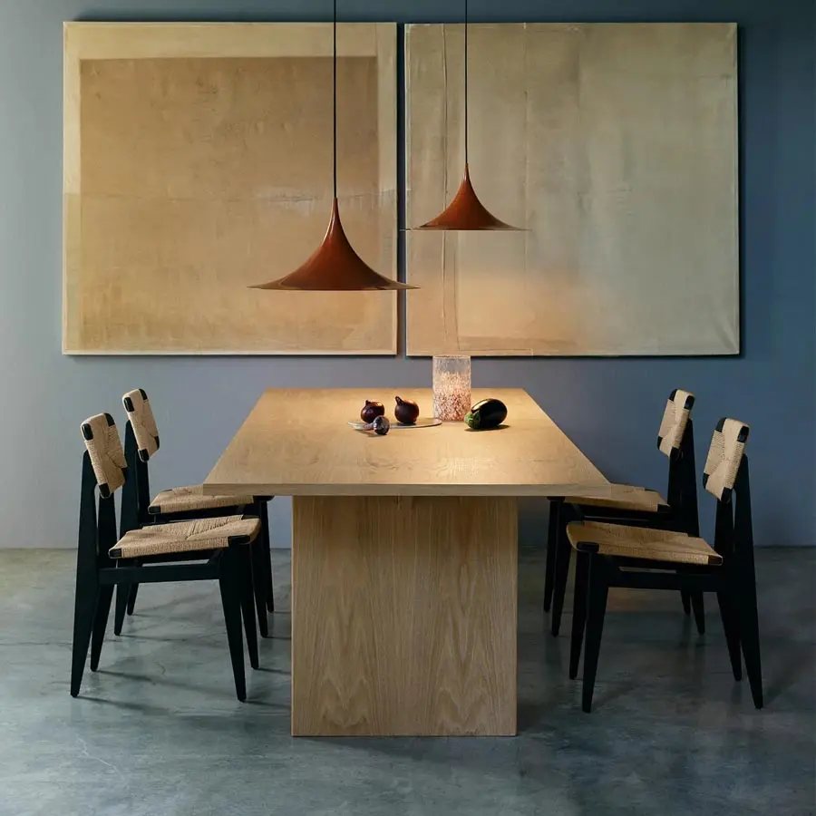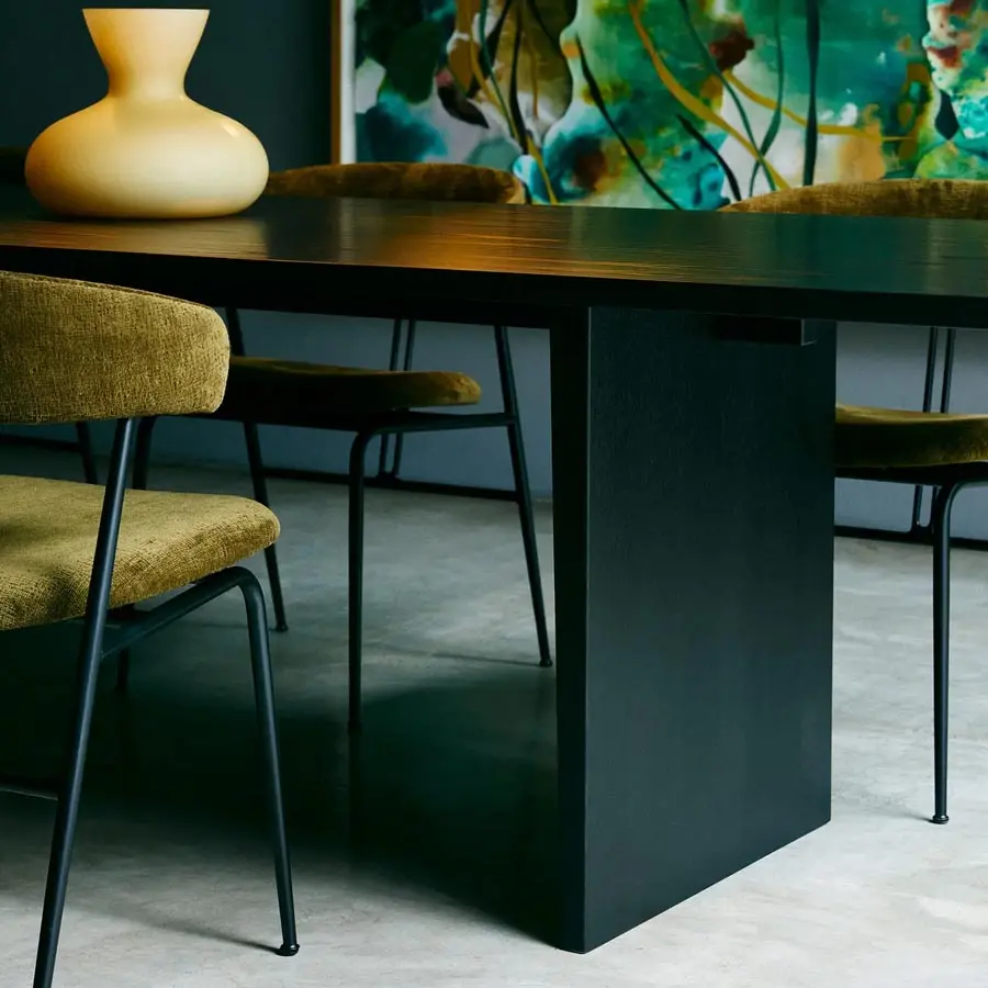 Las mesas de comedor Private comparten la elegancia, simetría e inspiración de las técnicas tradicionales de ensamblaje japonés con el resto de la colección private de Space Copenhagen. Las encimeras de madera enchapada, en fresno teñido en negro y roble claro, se unen a las dos patas cónicas a través de una viga transversal de madera maciza, lo que resulta en una postura sólida y una apariencia refinada.
