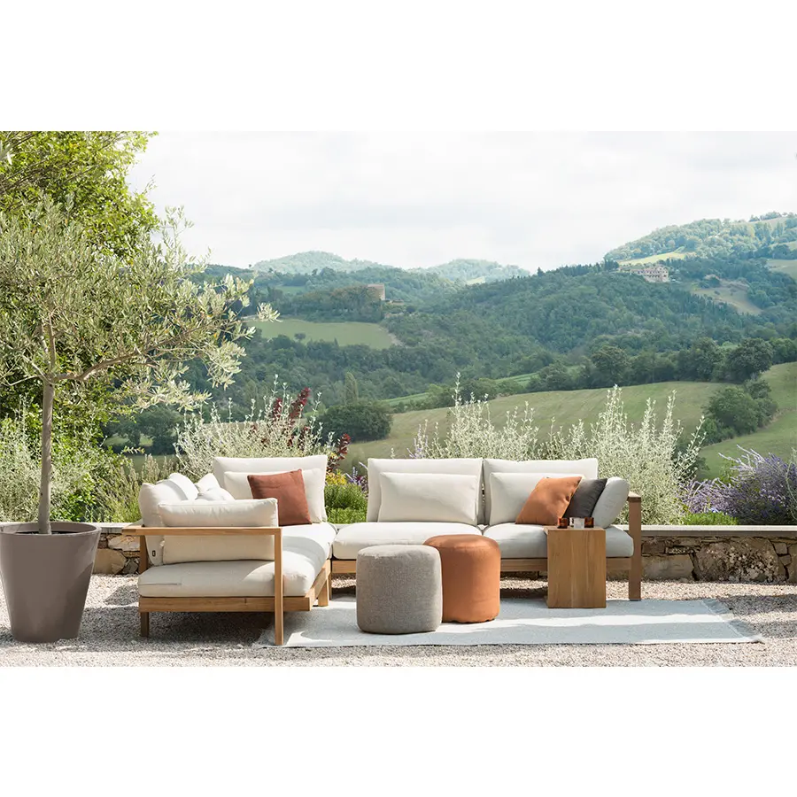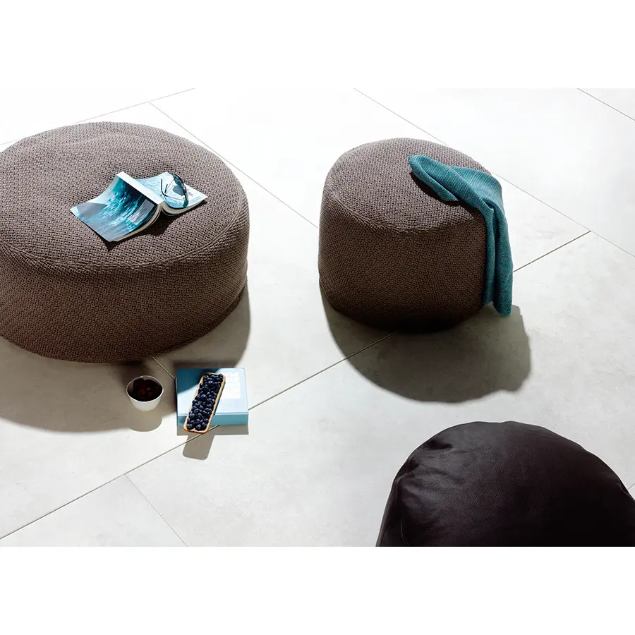 Los pufs tienen un relleno resistente a la intemperie y son muy cómodos. Puede elegir entre setenta tejidos de exterior diferentes, desde preciosos tejidos lisos hasta lujosos tejidos con textura. dia 45cm – H40cm – dia 60cm – H42cm – dia 90cm – H38cm