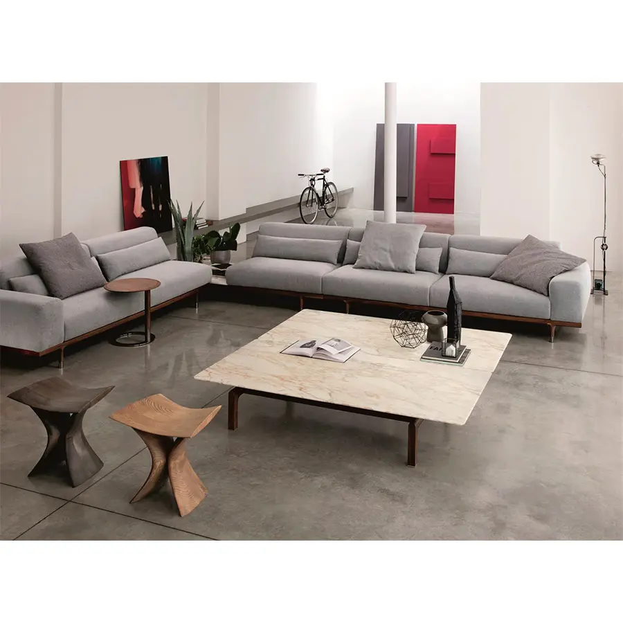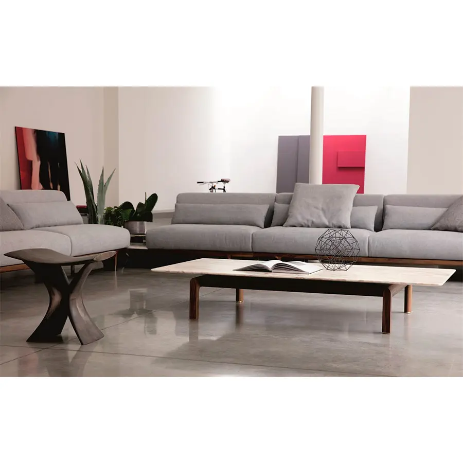 Mesa de centro rectangular con base en nogal canaletta macizo, pies en latón cepillado y tapa en mármol.