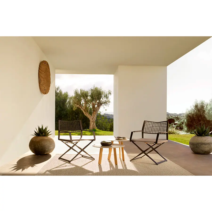 Con Regista, la diseñadora italiana Monica Armani aporta una actualización sofisticada a la silla arquetípica de director. Eso lo hizo prestando especial atención al detalle y mezclando conocimientos y materiales altamente tecnológicos. El resultado es una silla fina, perfectamente equilibrada, que destaca por su diseño atemporal. El respaldo se ha tejido a mano con Tricord, una fibra resistente a la intemperie que también se ha utilizado en el tapizado de los reposabrazos.