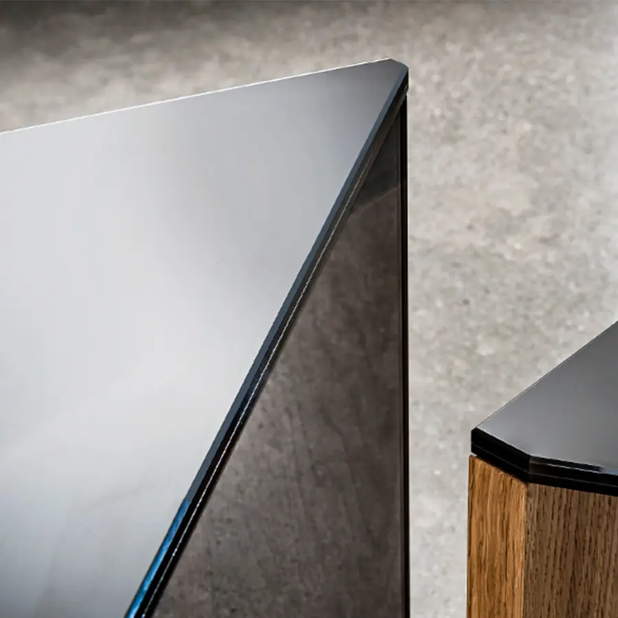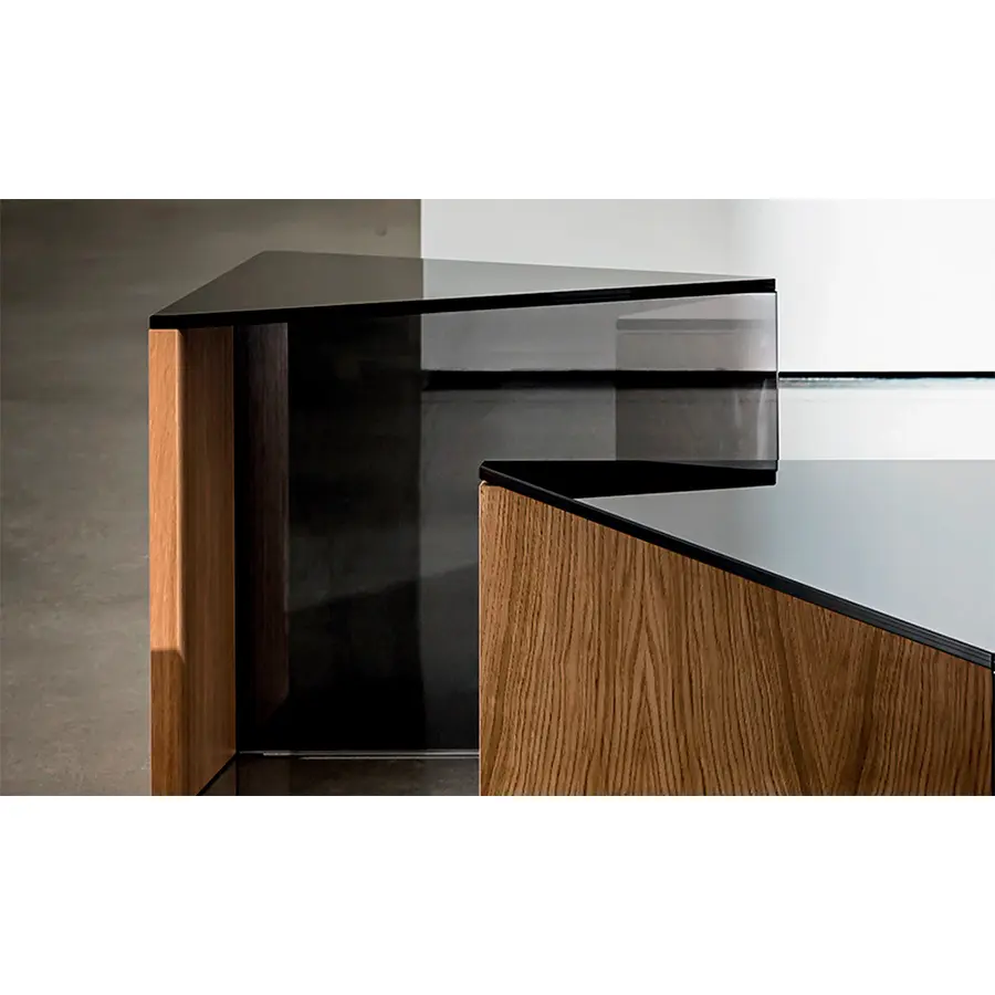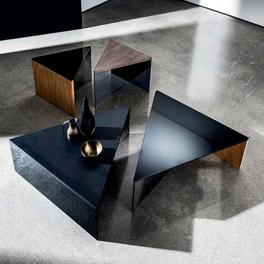 Mesa de centro moderna triangular disponible con tapa en vidrio laminado negro o en madera, varios acabados.