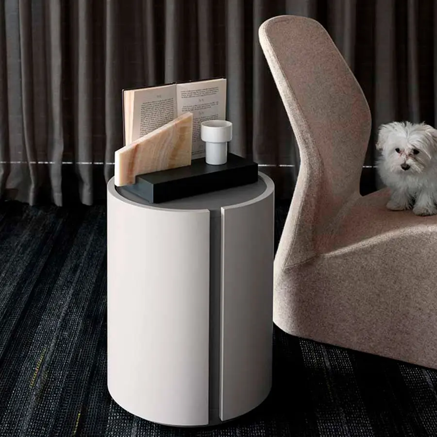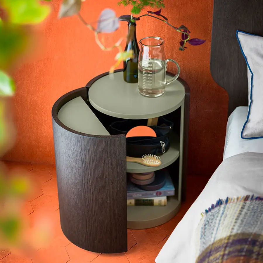 Rim es una mesita de noche con puerta o compartimento abierto que se caracteriza por sus formas curvas y dimensiones compactas. La variante bicolor disponible acentúa sus perfiles y la hace aún más versátil.