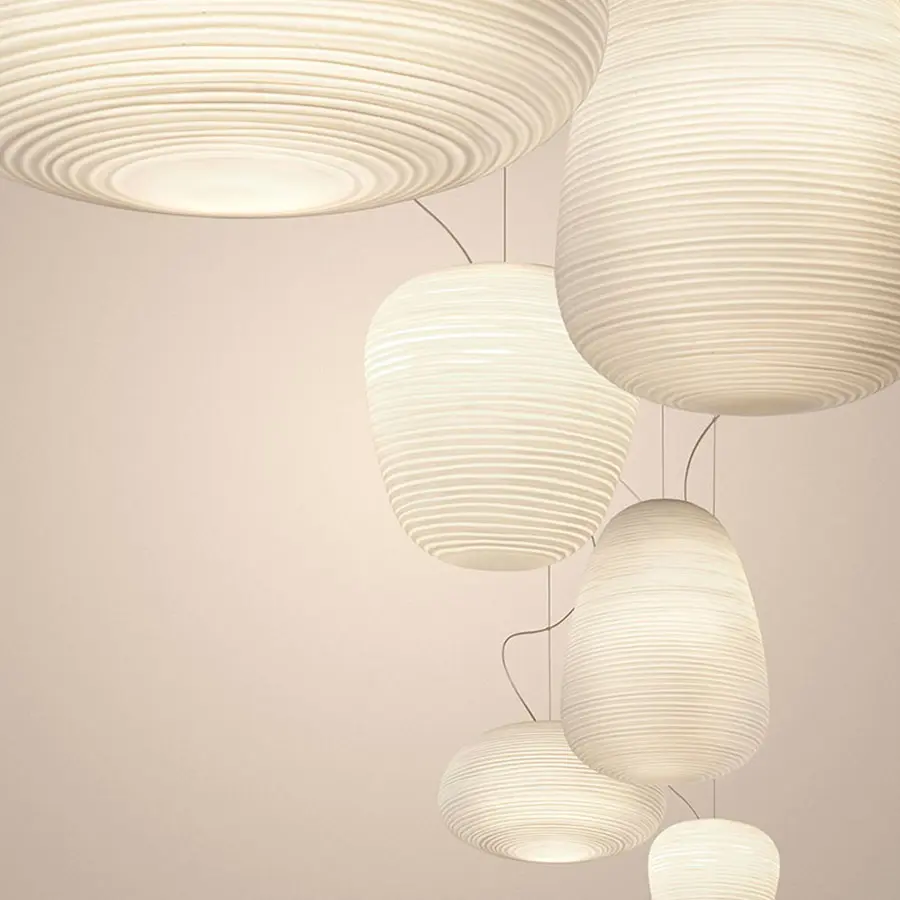 Lámparas colgante de luz difusa. Uno, dos, tres faroles ligeros pero repletos de seductora matericidad. Tres formas distintas y al mismo tiempo complementarias, en equilibrio entre oriente y occidente. Una familia de lámparas que lleva una luminosidad relajante en los ambientes más diversos, traduciendo la magia del papel de arroz o de la corteza de la morera, materia prima de las lámparas japonesas, en la apariencia preciosa del vidrio soplado y satinado.