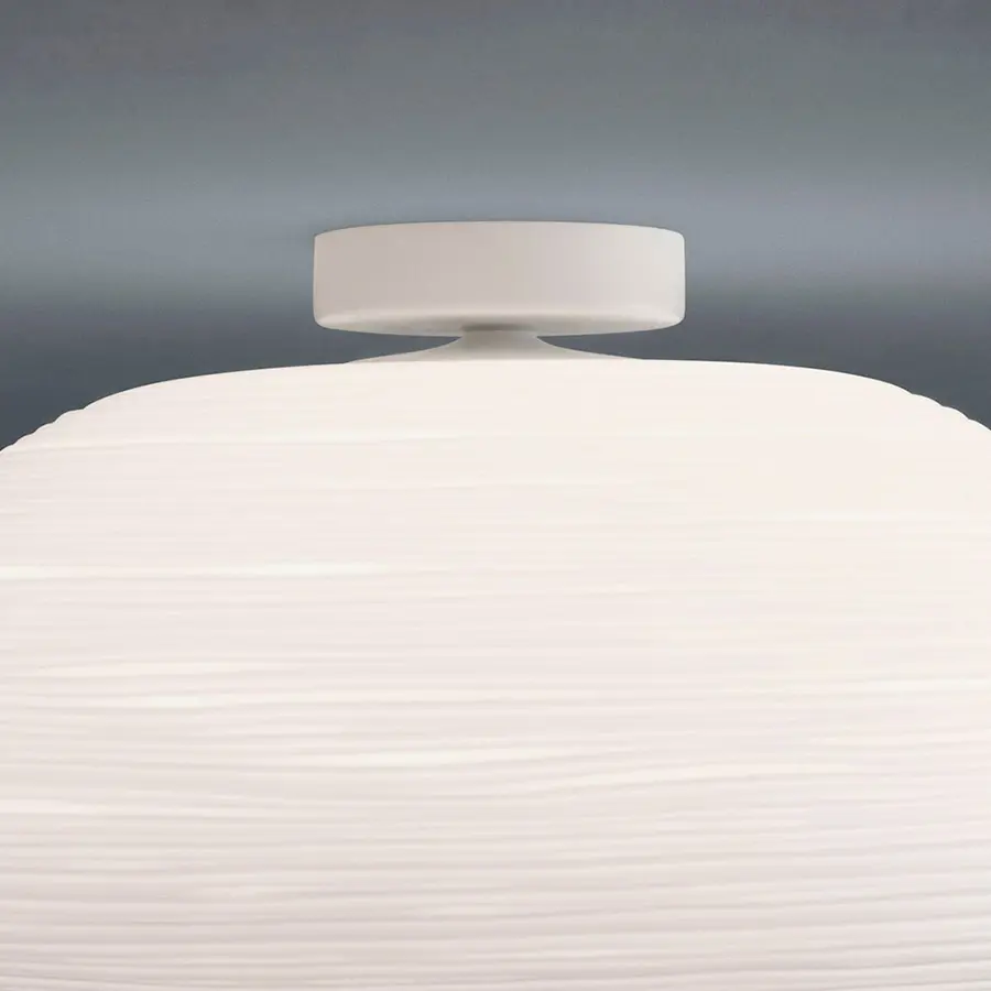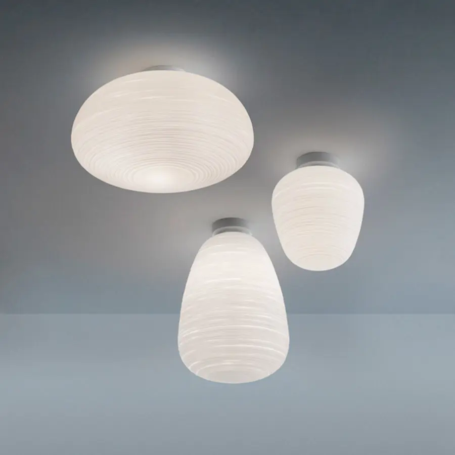 Rituals es un encuentro entre oriente y occidente, memoria y contemporaneidad, inspiración poética e investigación tecnológica. Una familia de formas distintas y complementarias que traduce la magia luminosa de los faroles de papel de arroz orientales en la apariencia preciosa del vidrio soplado. La particular elaboración del vidrio, con líneas irregulares que inciden la superficie, se ha obtenido gracias a la industrialización del proceso artesanal del pulido. El resultado es una decoración suave y fascinante que crea una inimitable sensación de claroscuro y una luz suave y difusa. La fuerza de este concepto de diseño ha permitido el desarrollo de nuevos tamaños y declinaciones de uso. Hablamos no de simples adaptaciones sino de auténticas exploraciones de ulteriores posibilidades para este proyecto. También la versión de techo, que se encuentra disponible en tres formas y medidas distintas, presenta el difusor en su totalidad gracias a una estructura discreta, una pura y simple forma circular que deja al vidrio la parte del protagonista.