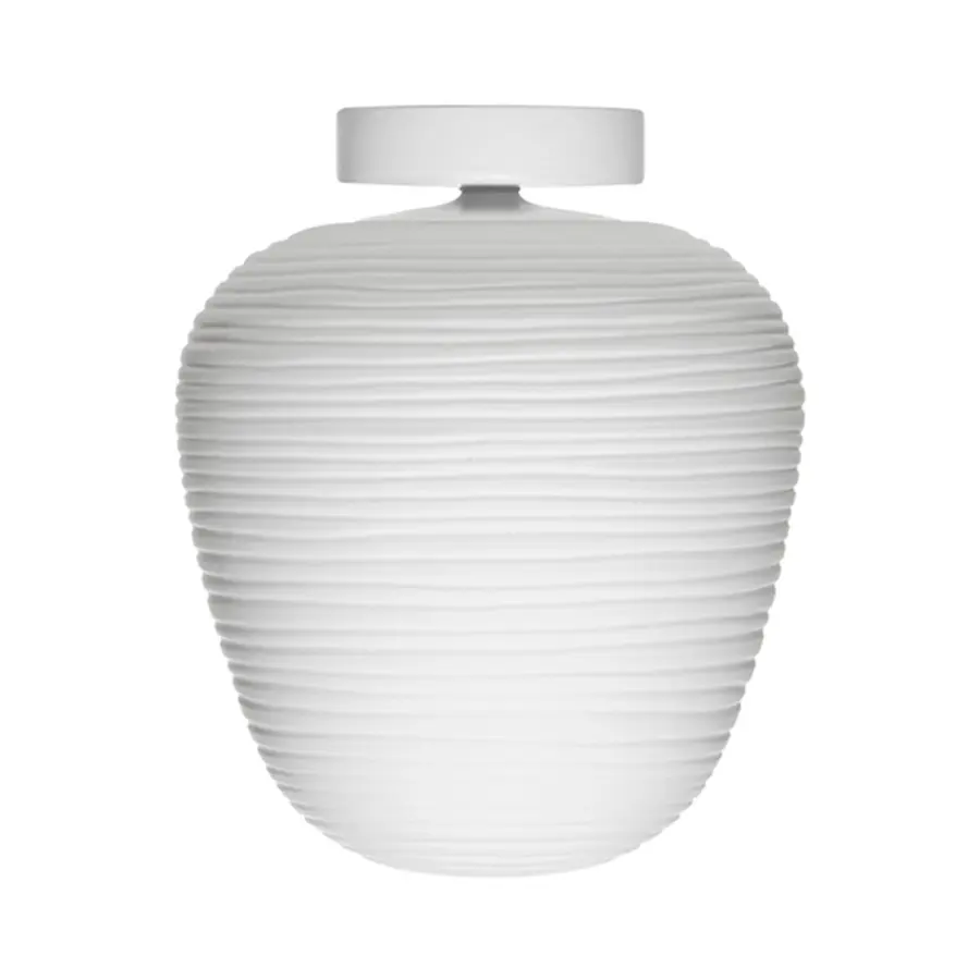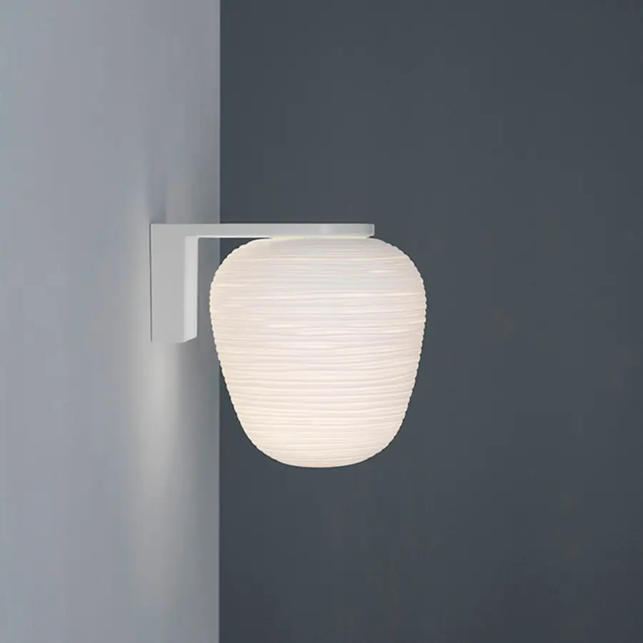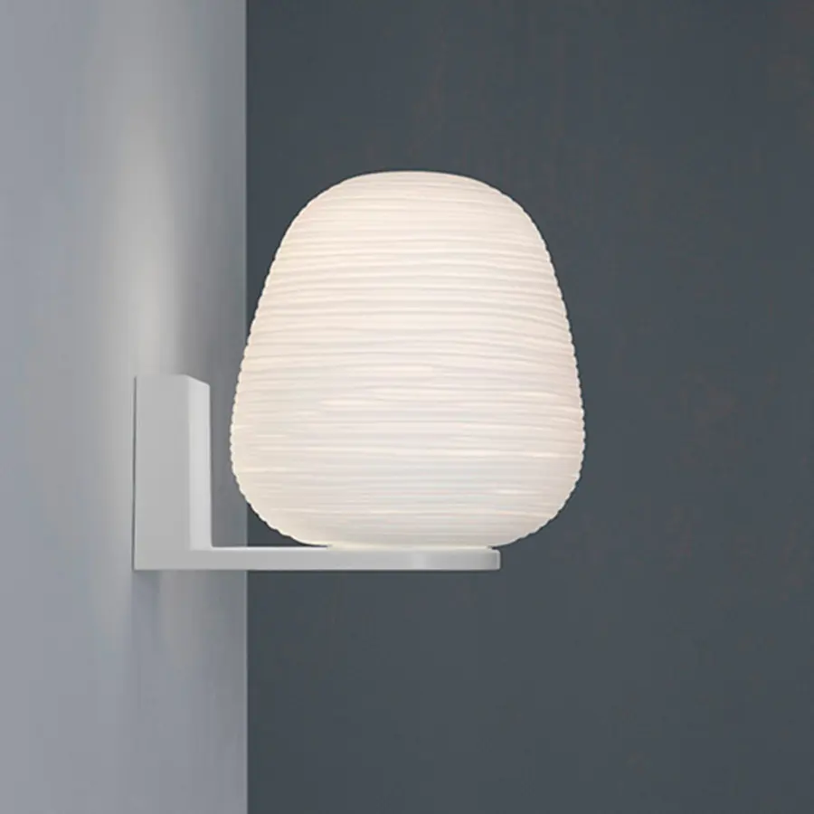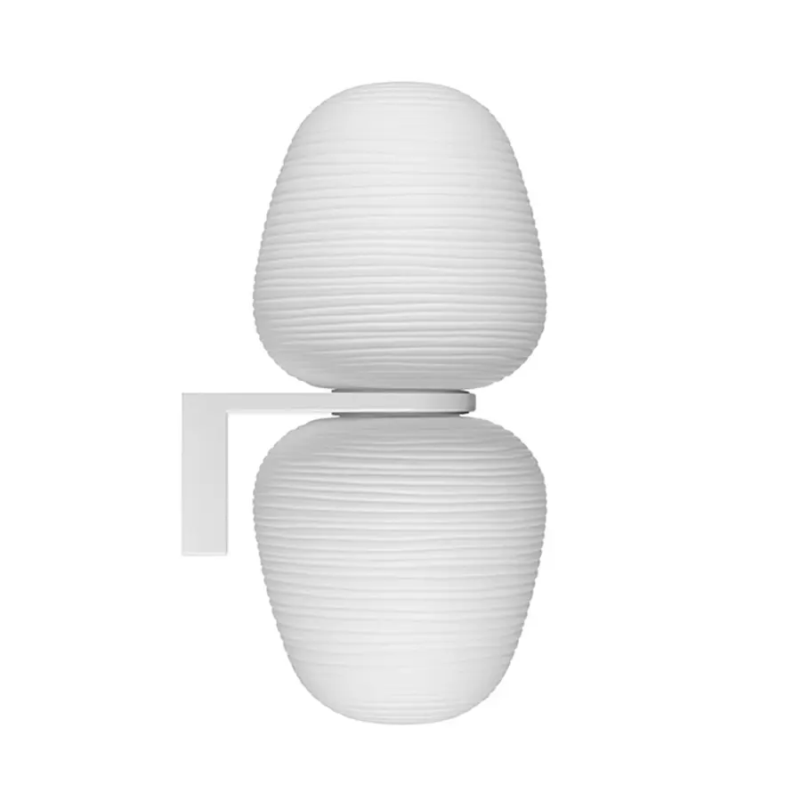 Rituals es un encuentro entre oriente y occidente, memoria y contemporaneidad, inspiración poética e investigación tecnológica. Una familia de formas distintas y complementarias que traduce la magia luminosa de los faroles de papel de arroz orientales en la apariencia preciosa del vidrio soplado. La particular elaboración del vidrio, con líneas irregulares que inciden la superficie, se ha obtenido gracias a la industrialización del proceso artesanal del pulido. El resultado es una decoración suave y fascinante que crea una inimitable sensación de claroscuro y una luz suave y difusa. Sorprende en un primer momento, por su fuerte presencia, la estructura de las versiones de Rituals de pared. Realizada en metal pintado con polvo blanco, tiene una forma escuadrada y fuerte, que contrarresta el volumen suave, etéreo y con acabado irregular del difusor en vidrio soplado, como los dos aspectos complementarios, uno técnico y otro emocional, de una personalidad única. Similar al pedestal de una obra de arte, la estructura presenta el precioso vidrio soplado en su totalidad, a 360°, destacando la particular luminosidad de esta lámpara. Su forma de L invertida permite diversas soluciones, hacia arriba o hacia abajo. Aguanta el difusor, que se encuentra disponible en dos tamaños, como si fuera una linterna, o bien parece que lo hace fluctuar en el aire. Es posible solicitar también una versión que monta dos difusores, uno encima y uno debajo del apoyo de pared.