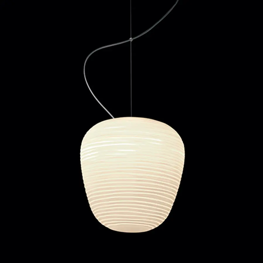 Las líneas horizontales, que graban la superficie de las lámparas, dan vida a una decoración suave y fascinante pero, contemporáneamente, contribuyen a filtrar la intensidad de la fuente luminosa, difundiendo una luz llena, cálida y suave en el ambiente. Con su cuerpo en vidrio soplado, de apariencia agradablemente yesosa, las lámparas Rituals de de suspensión se pueden utilizar solas o en composiciones armoniosas de 3 y hasta 9 lámparas, gracias a la utilización de un florón múltiple.