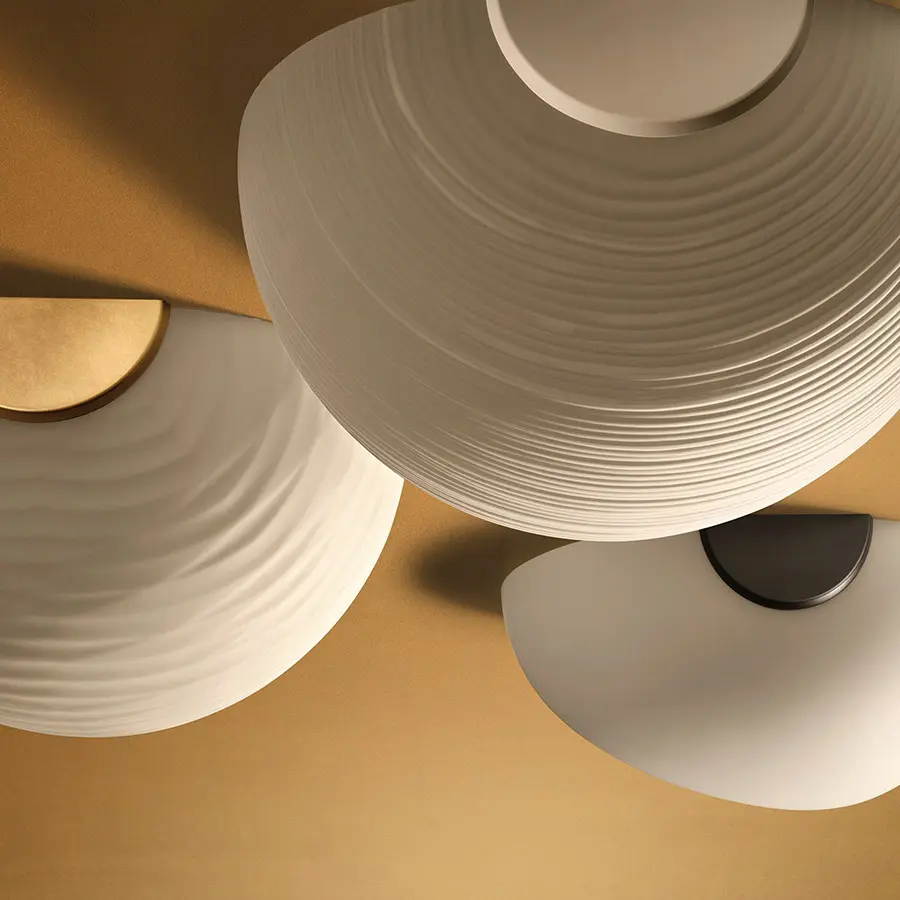 Una familia de lámparas con una luz relajante para ambientes muy diversos que interpreta la magia del papel de arroz o de la corteza de morera, materia prima de las lámparas japonesas, en la corporeidad preciosa del vidrio soplado y satinado. Las líneas horizontales que inciden en la superficie de las lámparas producen una decoración suave y fascinante a la vez que moderna, además de contribuir a filtrar la intensidad de la fuente de iluminación, difundiendo una luz plena, cálida y suave en el ambiente.