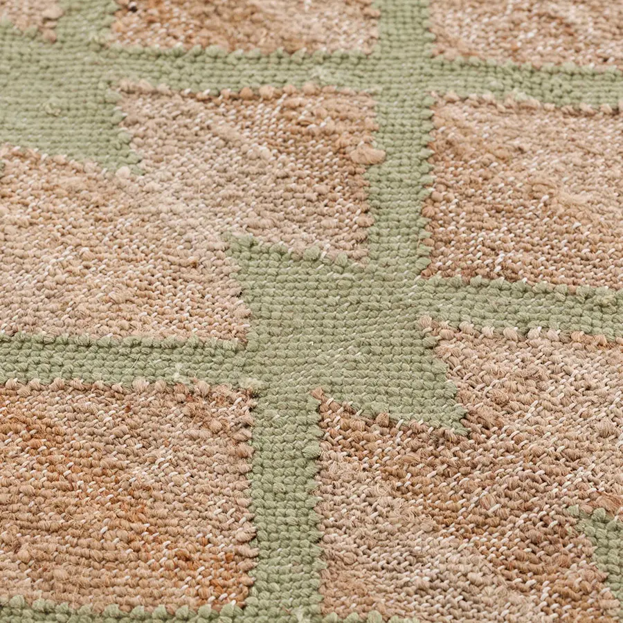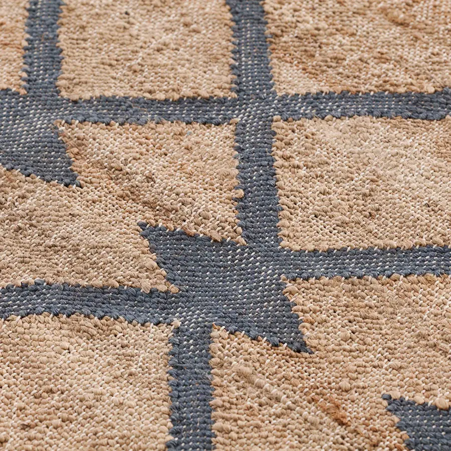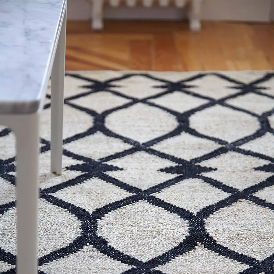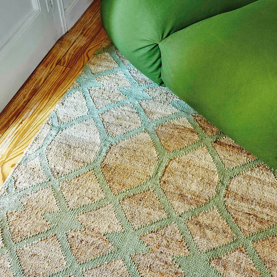 Modelo con el motivo en distintos colores de la alfombra Rodas, un innovador diseño de nuestra colección de kilims que mezcla dos materiales que producen un atractivo contraste. Se elabora con la misma técnica artesanal que se usa para hacer kilims pero empleando yute para la base y viscosa para el dibujo, inspirado en las rejas tradicionales de forja. El yute aporta un acabado rugoso y mate, mientras que la viscosa es suave y con brillo.