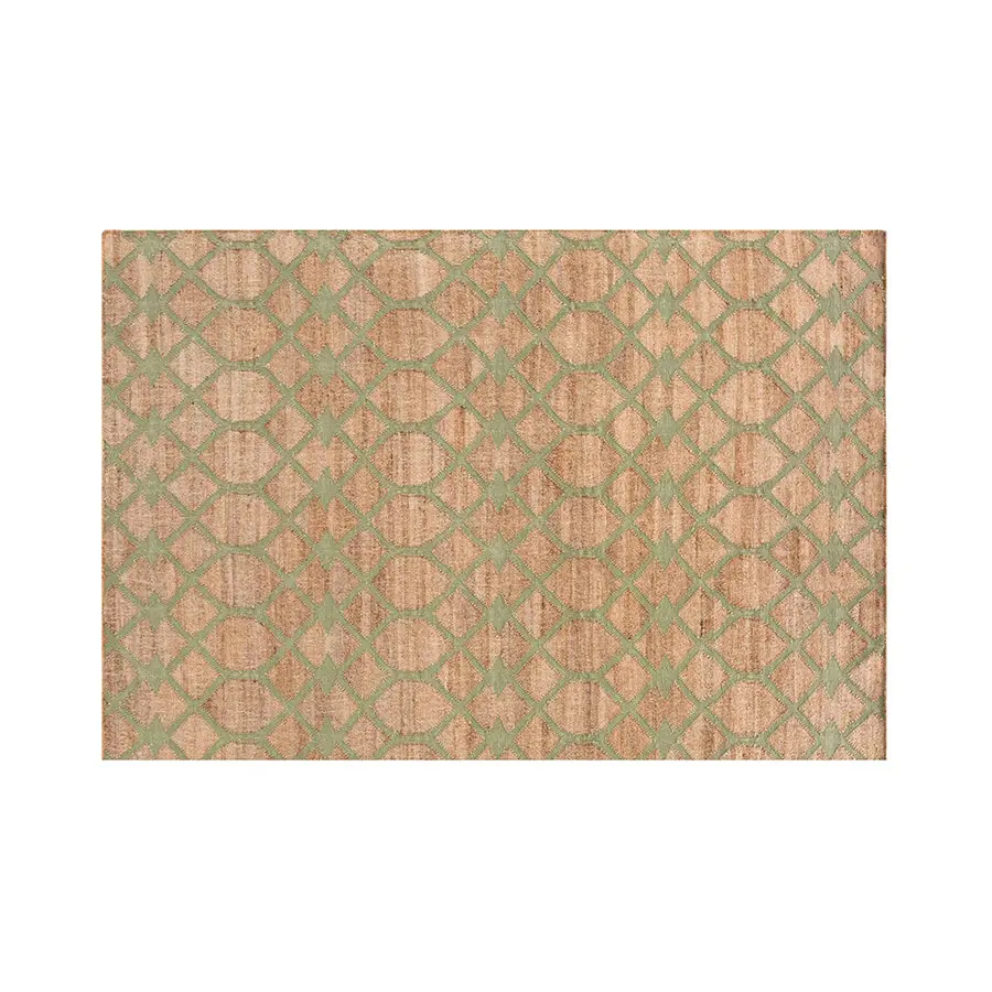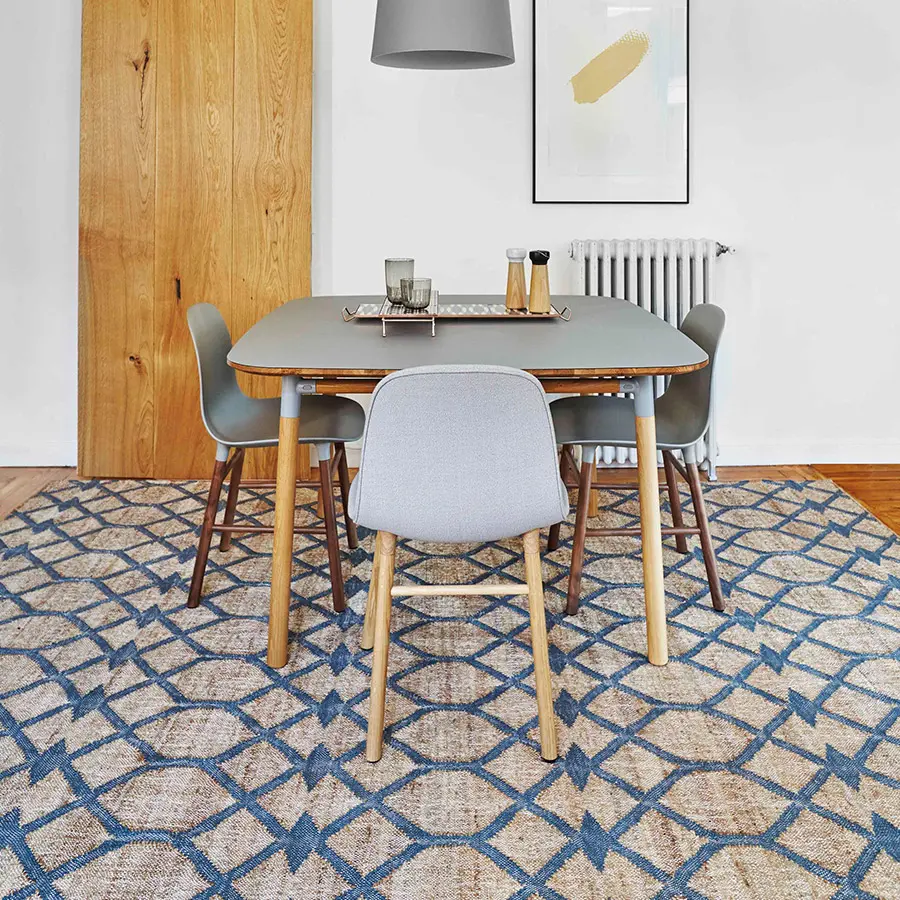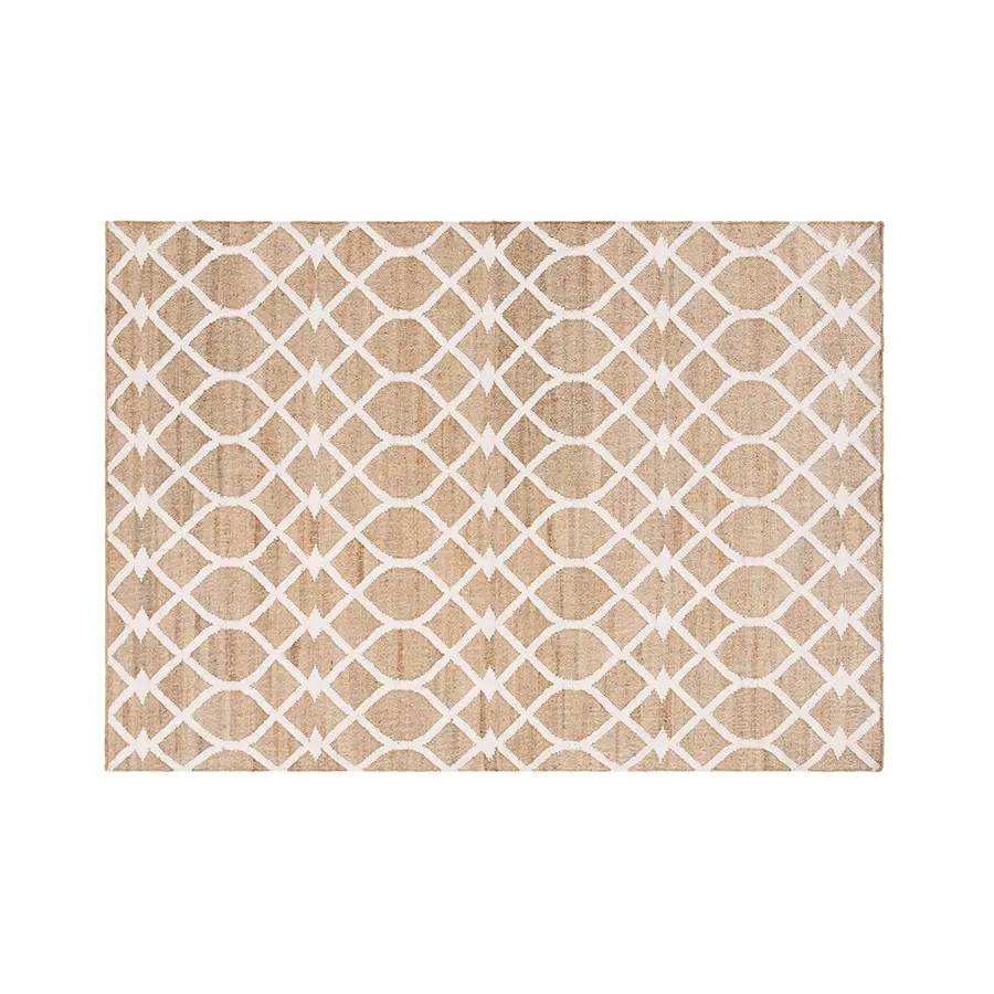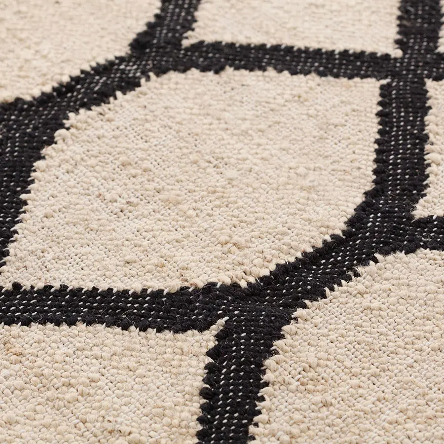 Modelo con el motivo en distintos colores de la alfombra Rodas, un innovador diseño de nuestra colección de kilims que mezcla dos materiales que producen un atractivo contraste. Se elabora con la misma técnica artesanal que se usa para hacer kilims pero empleando yute para la base y viscosa para el dibujo, inspirado en las rejas tradicionales de forja. El yute aporta un acabado rugoso y mate, mientras que la viscosa es suave y con brillo.
