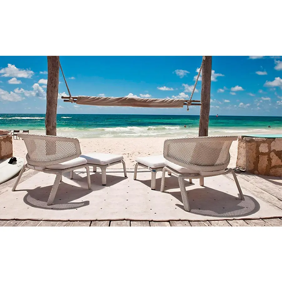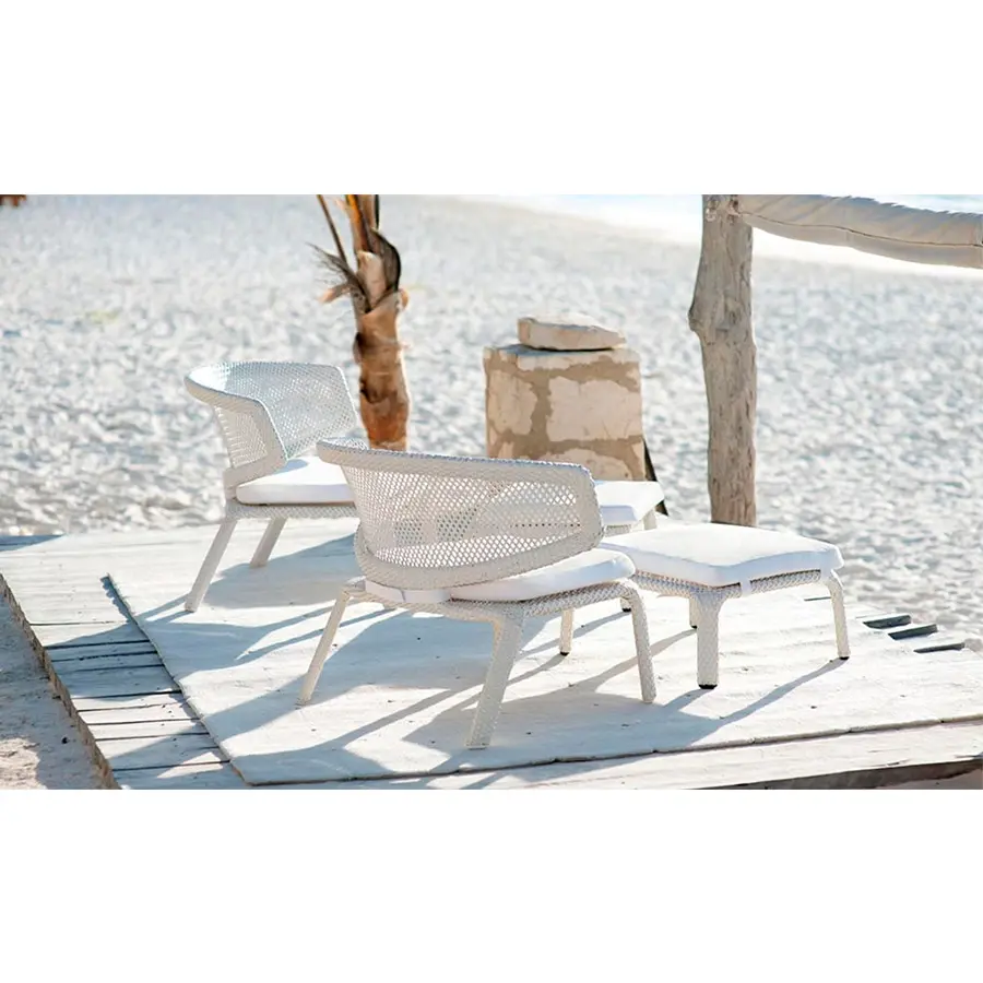 Formas abiertas, siluetas y formas ligeras se combinan en la nueva colección SEAS HELL de DED ON con confort y resistencia. Así surge la idea de un refugio lleno de seguridad natural, preparado para los hermosos momentos de la vida. Todos los elementos de la colección SEAS HELL son aptos tanto para el uso en interiores como en superficies exteriores grandes, como restaurantes, piscinas y terrazas. Los anchos respaldos están adaptados a las necesidades ergonómicas de las personas y abrazan con comodidad y diseño clásico. Así se acerca la persona a la naturaleza durante la relajación, en interiores y exteriores, día y noche. El trenzado abierto de la colección destaca el aspecto ligero y combina el aspecto práctico con unas formas extraordinarias.