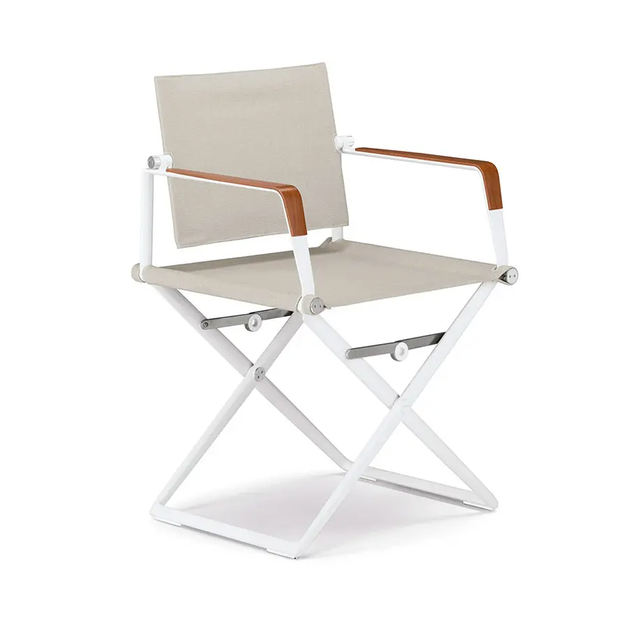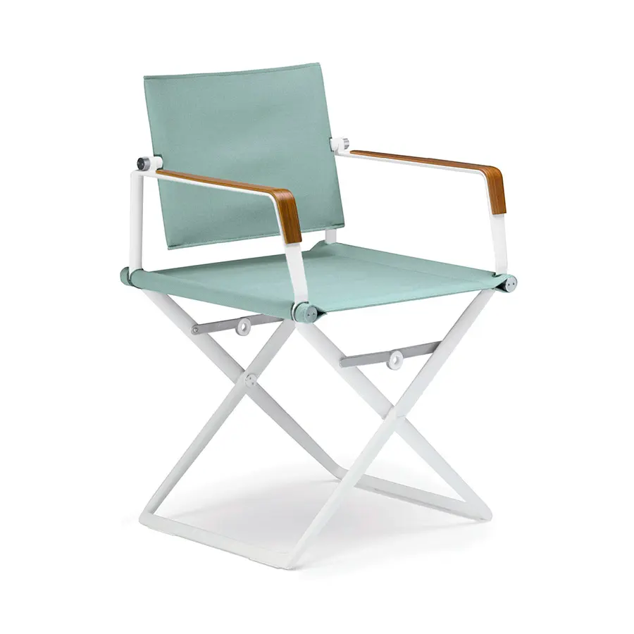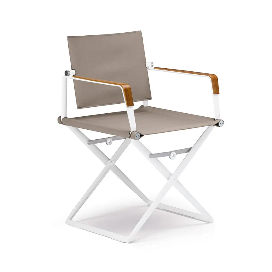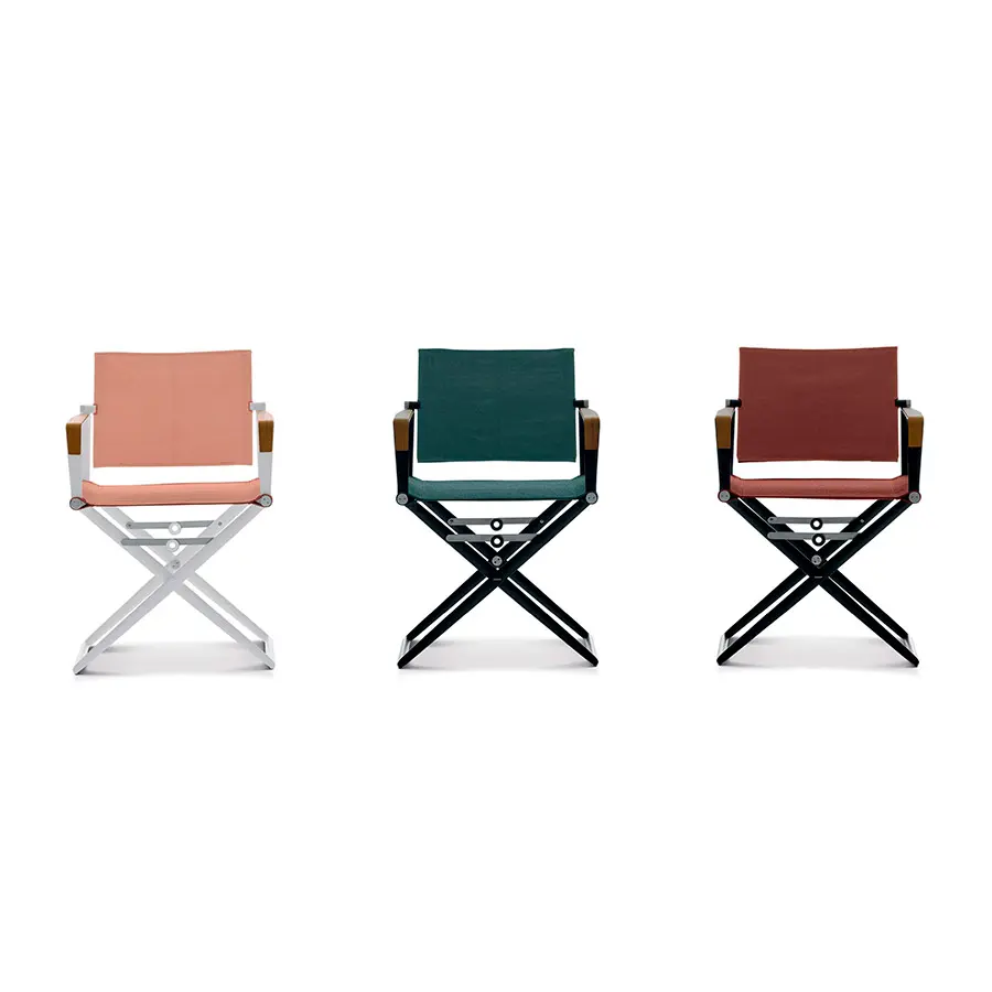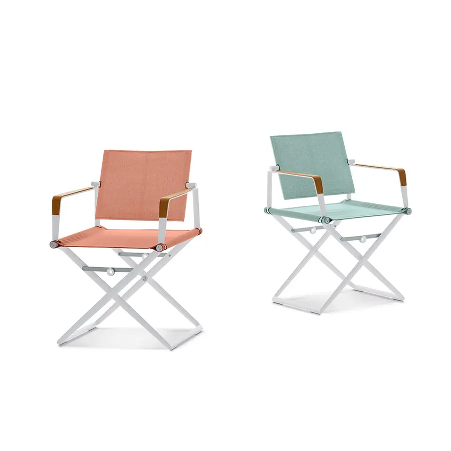 Disponible con reposabrazos con o sin teca, estructura en aluminio blanco o negro e infinidad de acabados textiles que se han incorporado a la colección.