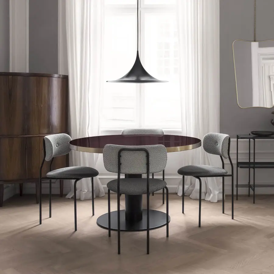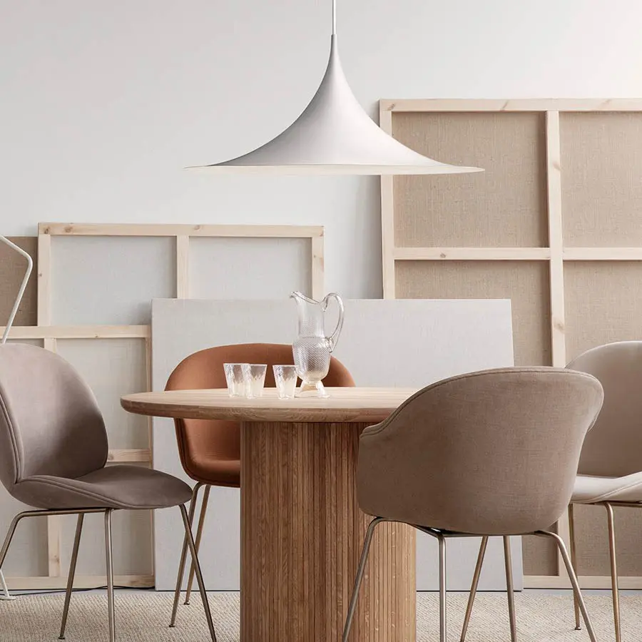 Diseñada por Bonderup & Thorup, la lámpara colgante de Gubi Semi es una pieza única elaborada a partir de dos cuartos de círculo de metal esmaltado, fusionados entre sí, creando una distintiva composición en forma de cono. Difunde una suave luz ambiental hacia abajo y, con su forma equilibrada y diseño atemporal único, es extremadamente versátil, idealmente situada sobre una mesa de comedor, en una sala de estar o en un dormitorio.