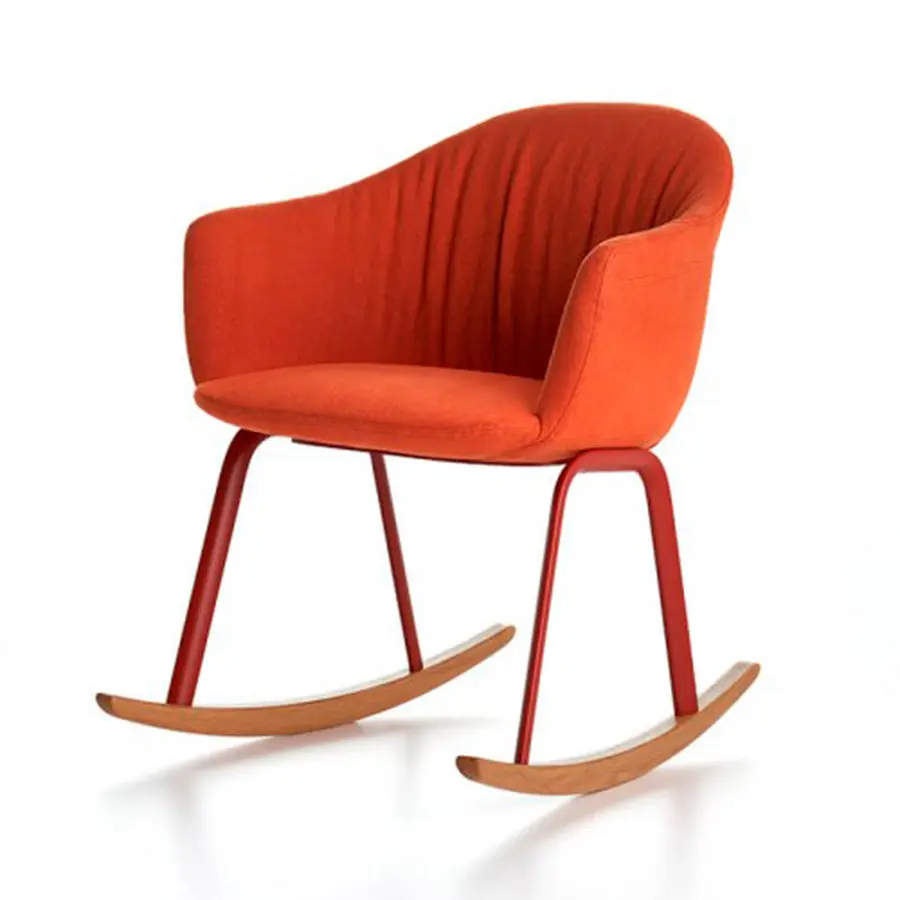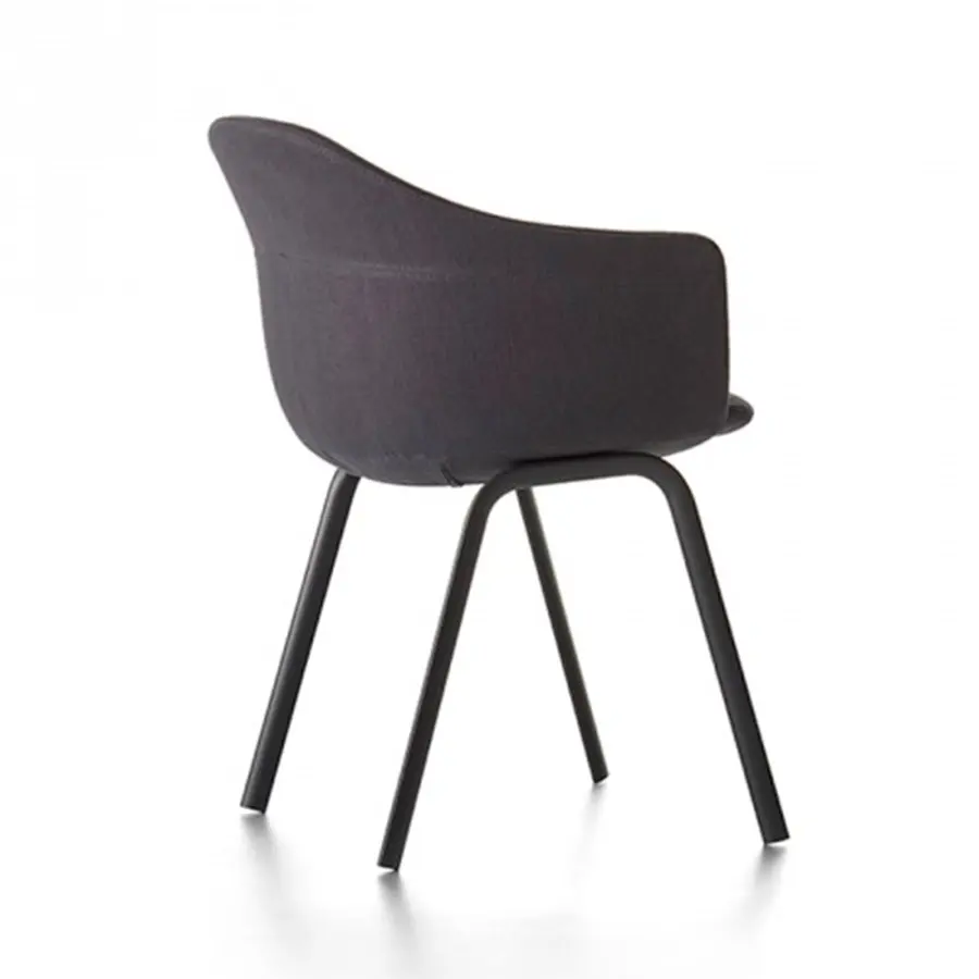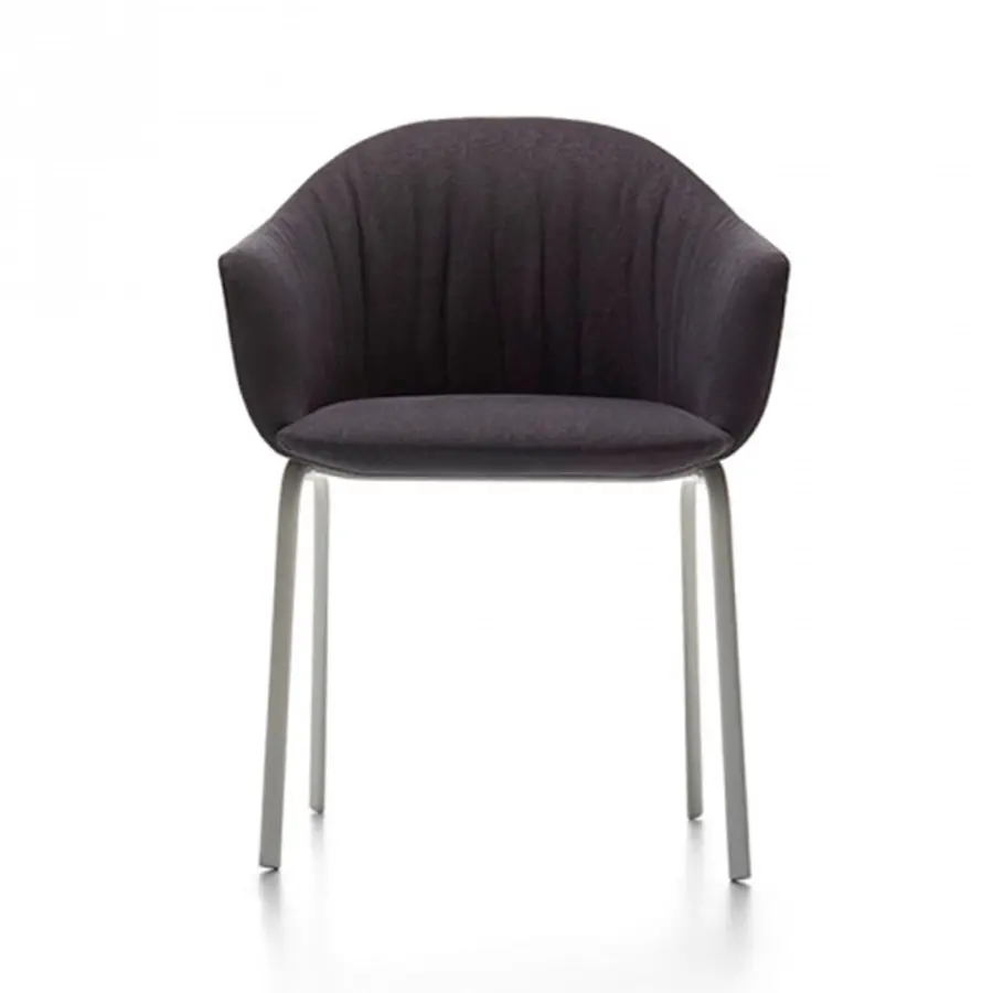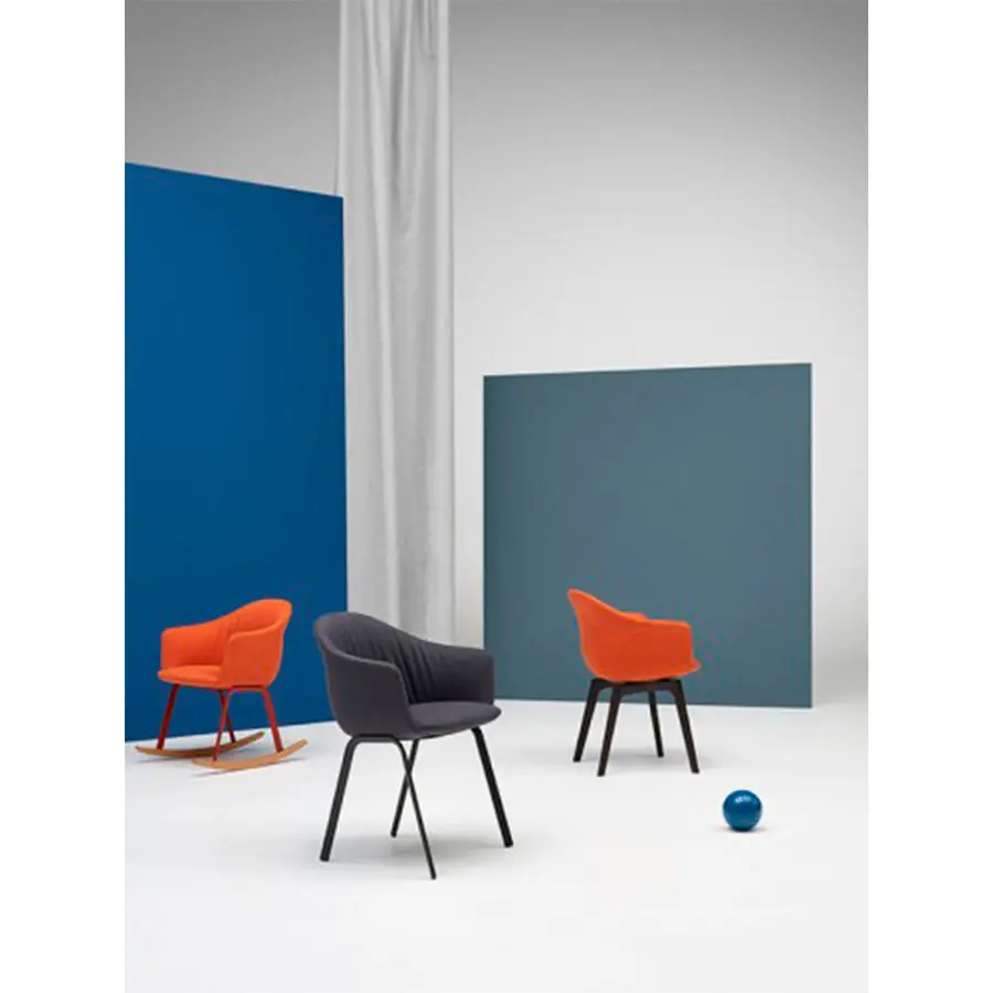 Un pequeño sillón acolchado de generosas dimensiones y una silueta suave y tranquilizadora. El exceso de tela confiere una sensación de movimiento a la superficie y resalta la sensación de comodidad y cordialidad.