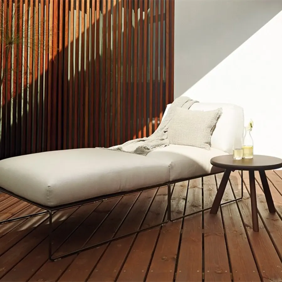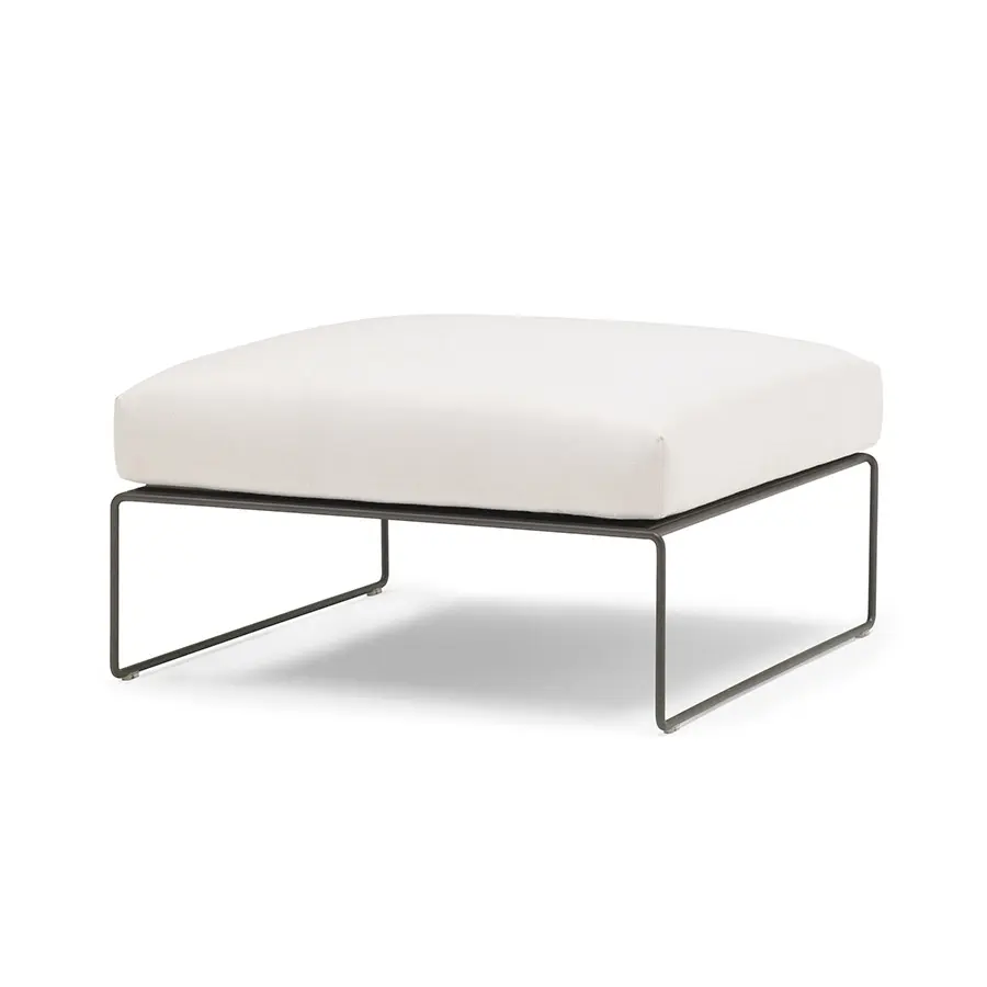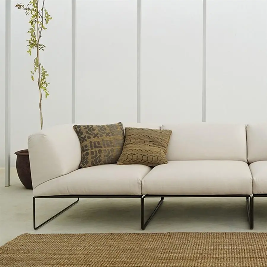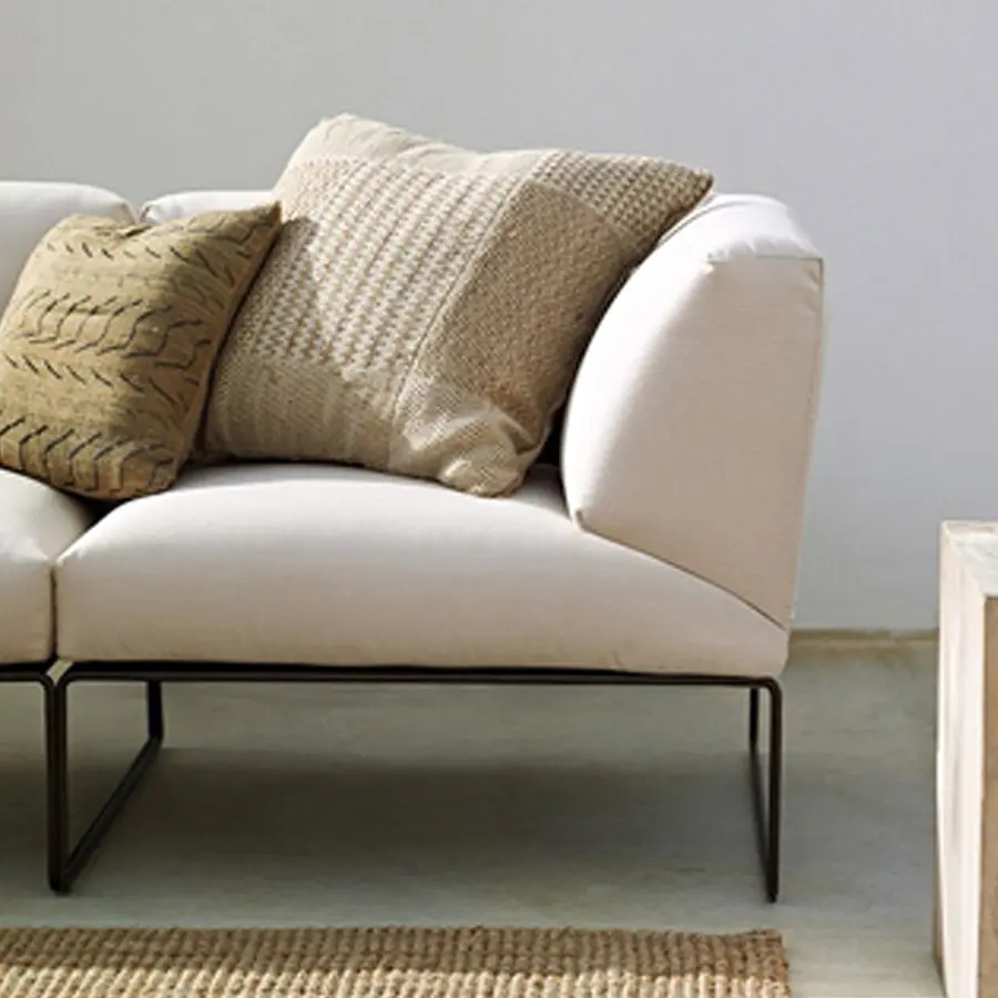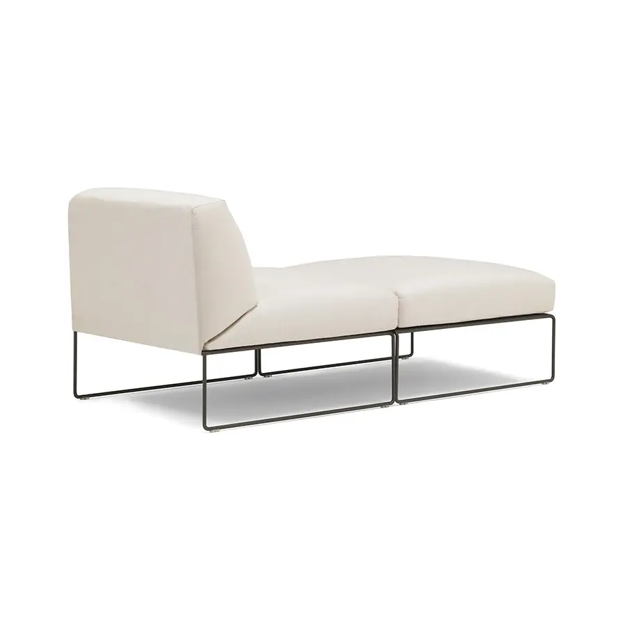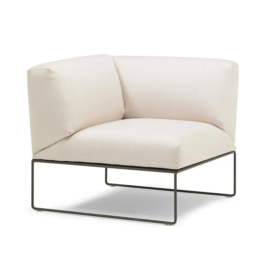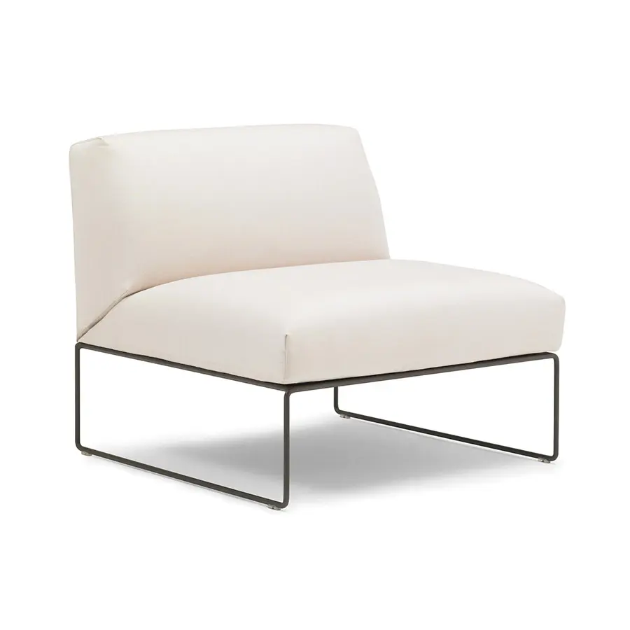 Sofá modular con asiento y respaldo tapizado y base de patín de varilla de acero con tratamiento EPL-5 para exterior disponible en diferentes acabados.