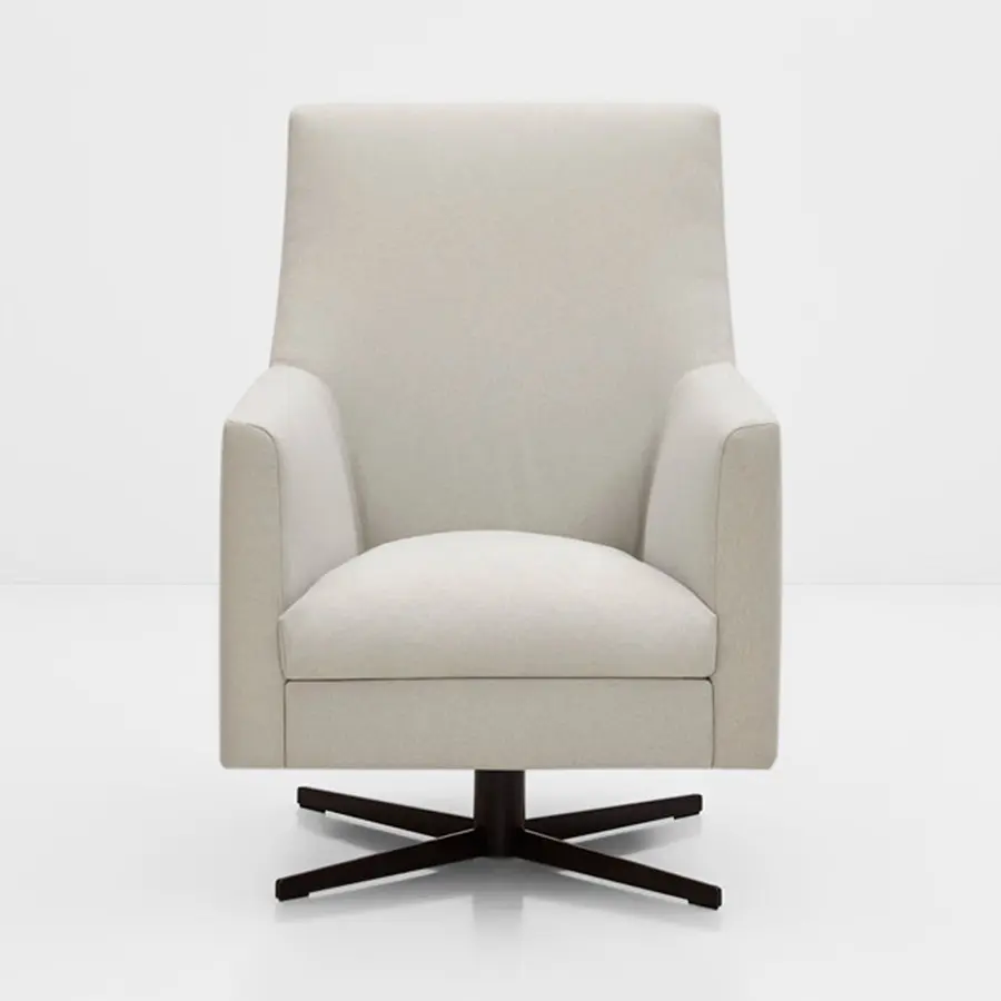 Hat es un diseño de líneas sencillas, realzadas por la costura o vivo que perfila su silueta. Con una suave inclinación, el cuerpo de la butaca constituye una sola pieza sobre la que se incorpora el cojín del asiento. El conjunto se apoya en un pie giratorio metálico o unas patas de tubo cromado. Tapicería totalmente desenfundable. En piel, cojín de asiento desenfundable.