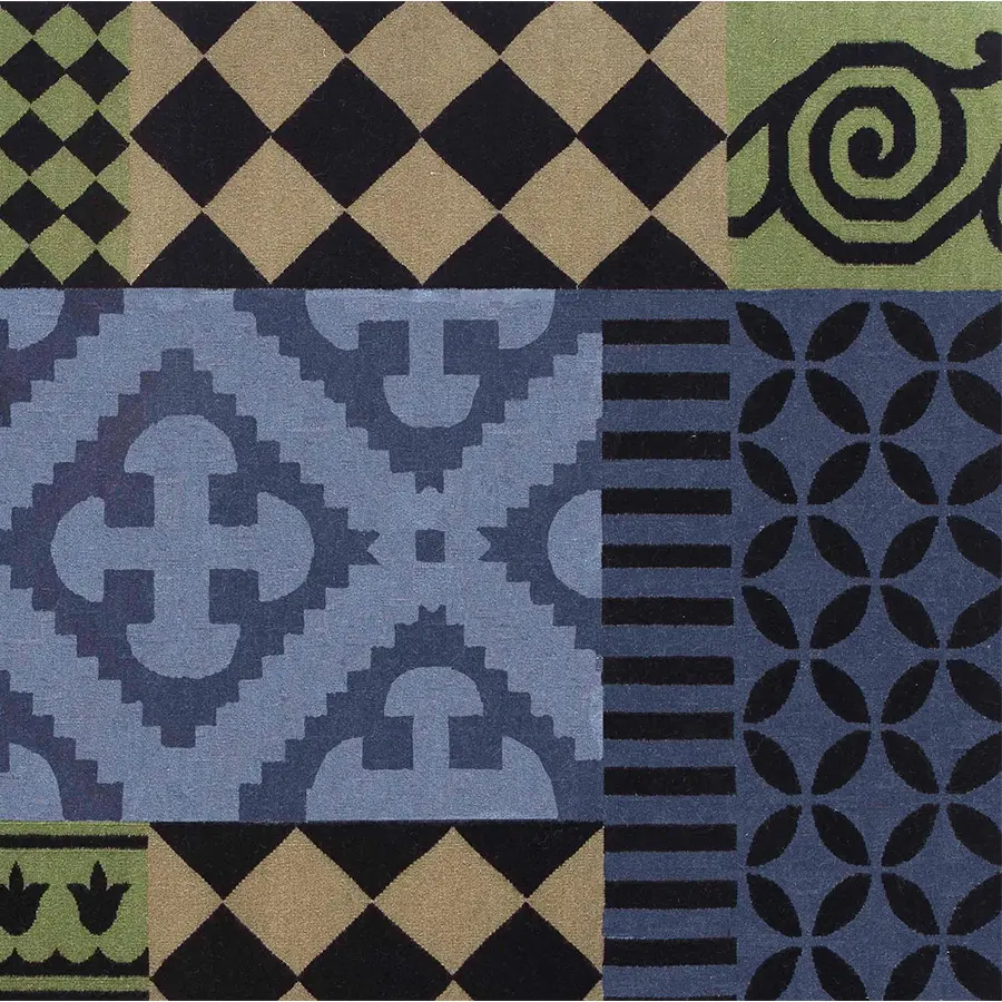 Esta es la alfombra Siracusa, un modelo de nuestra colección de kilims diseñado por Sandra Figuerola tomando como inspiración patrones de dibujo muy reconocibles de la cultura mediterránea, presentes de manera recurrente en azulejos, baldosas y cenefas antiguas. Una pieza perfecta como acento para espacios con una arquitectura interior o un pavimento neutros.