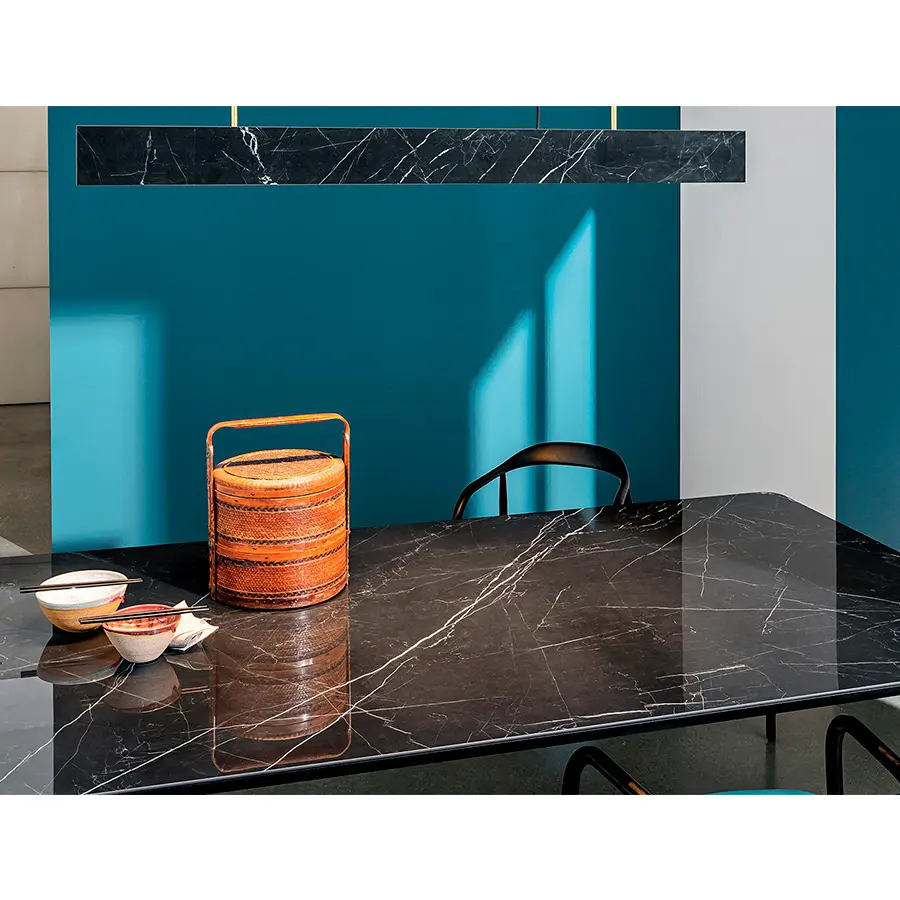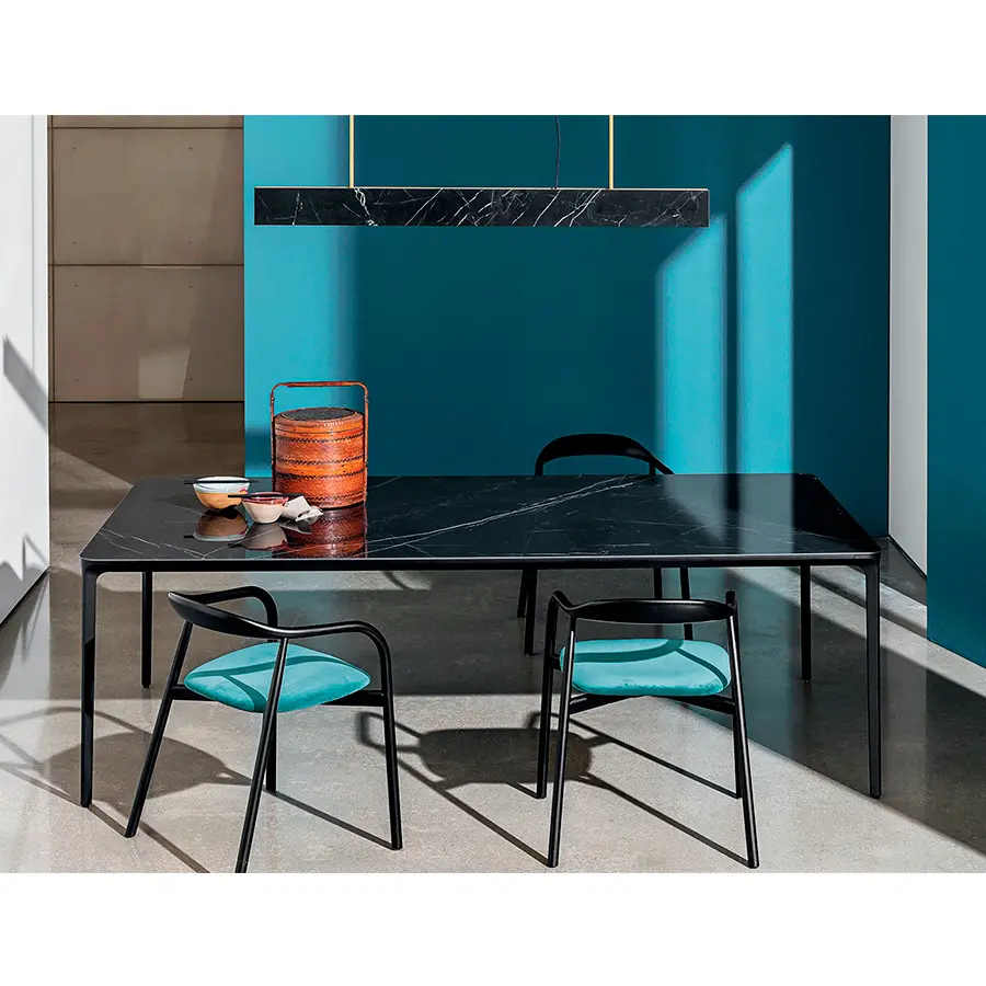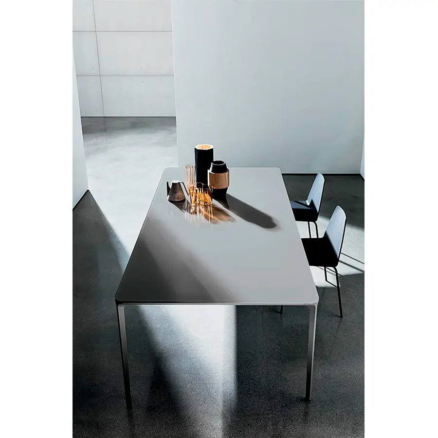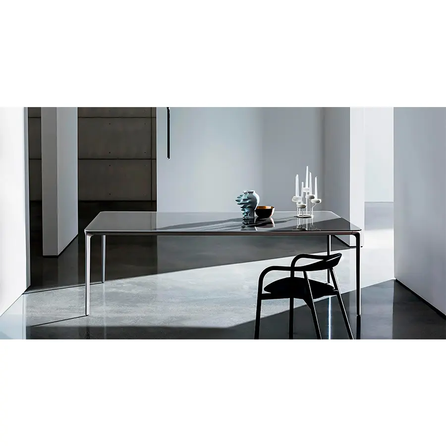 Disponible en múltiples acabados –desde cristal lacado o cerámico hasta madera o HPL–, Slim se adapta con elegancia tanto a comedores modernos como a espacios contract de alto nivel. El diseño de su perfil, sutil y perfectamente estudiado, permite crear mesas de grandes dimensiones sin que pierdan su estética ligera. Ya sea en formato fijo o extensible, la mesa Slim demuestra cómo el diseño italiano puede unir sofisticación y funcionalidad con maestría.