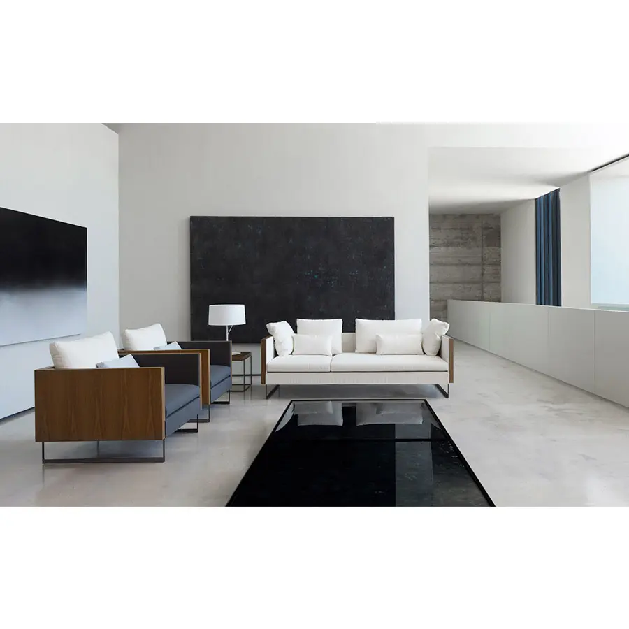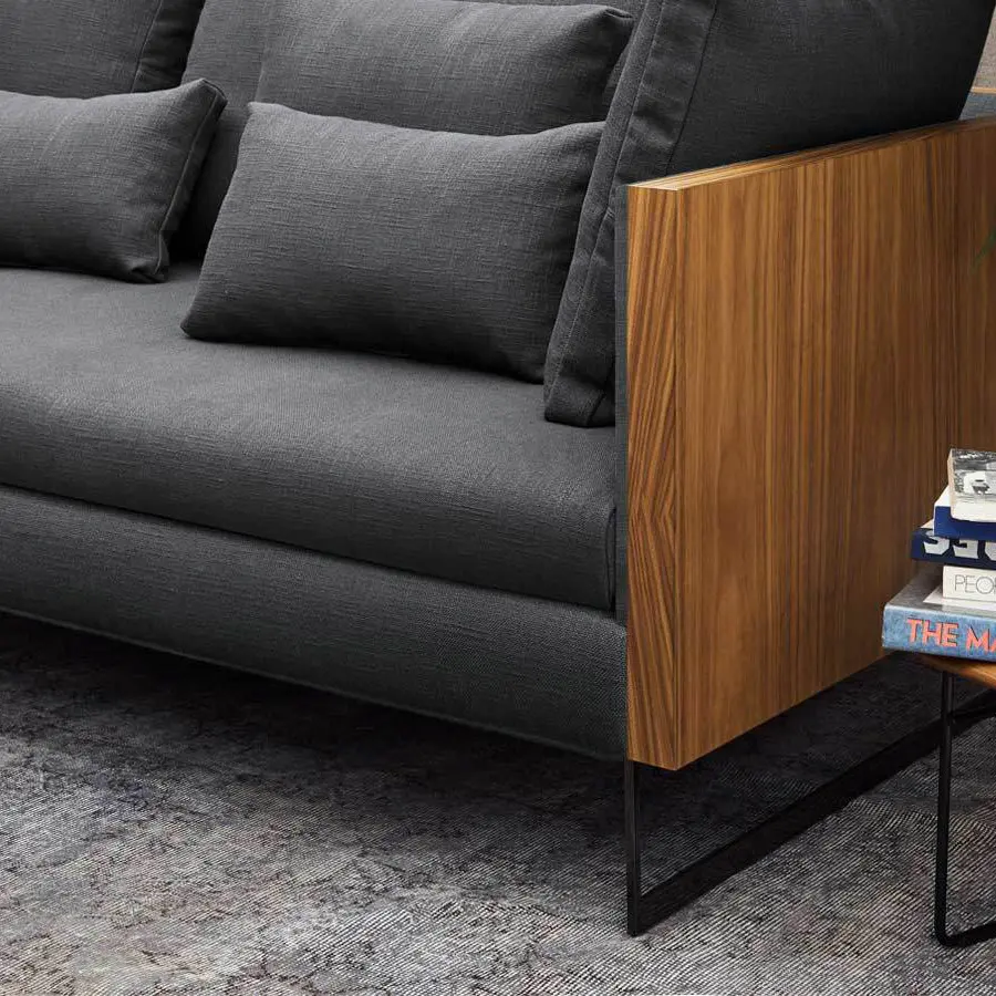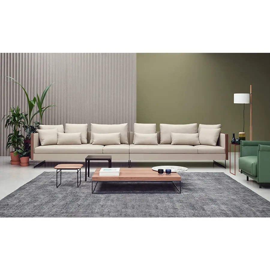 La colección Deck es un juego de contrastes entre materiales y formas. Su elegante cuerpo de madera, de inspiración arquitectónica, destaca aún más gracias a la calidez del interior tapizado. Tapicería desenfundable en base de asiento, cojines de asiento, cojines de respaldo y cojines auxiliares. En piel, cojines de asiento, cojines de respaldo y cojines auxiliares desenfundables.