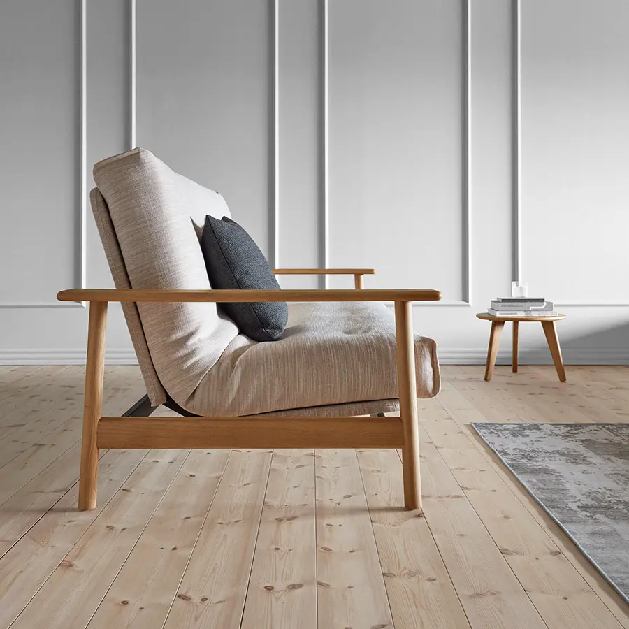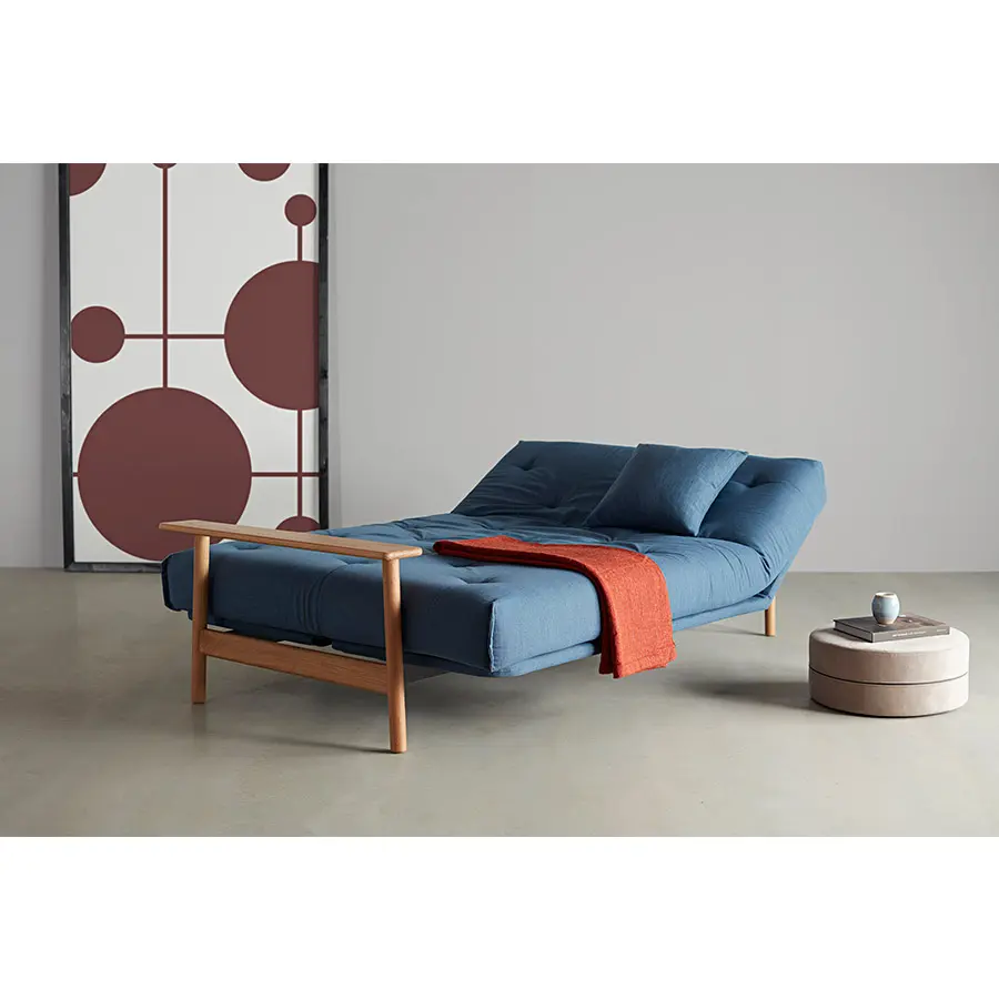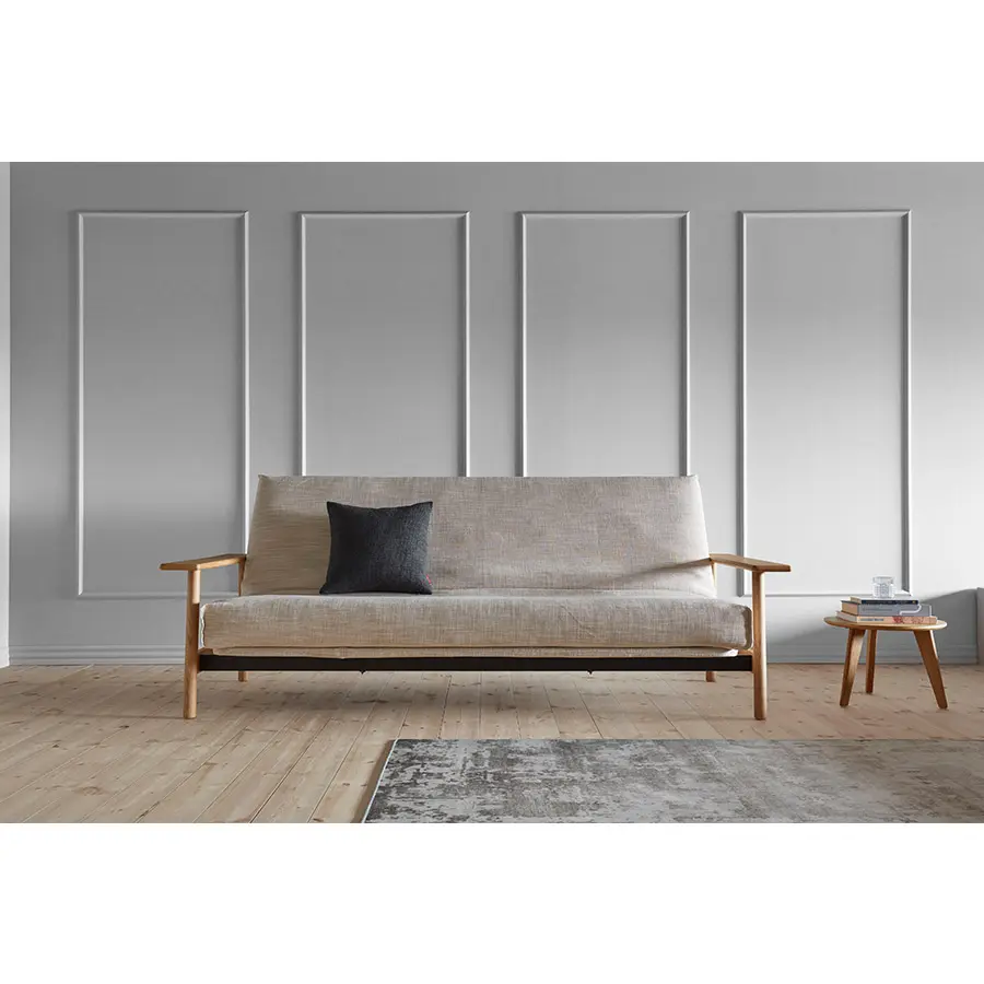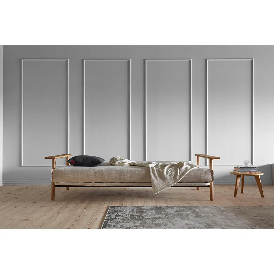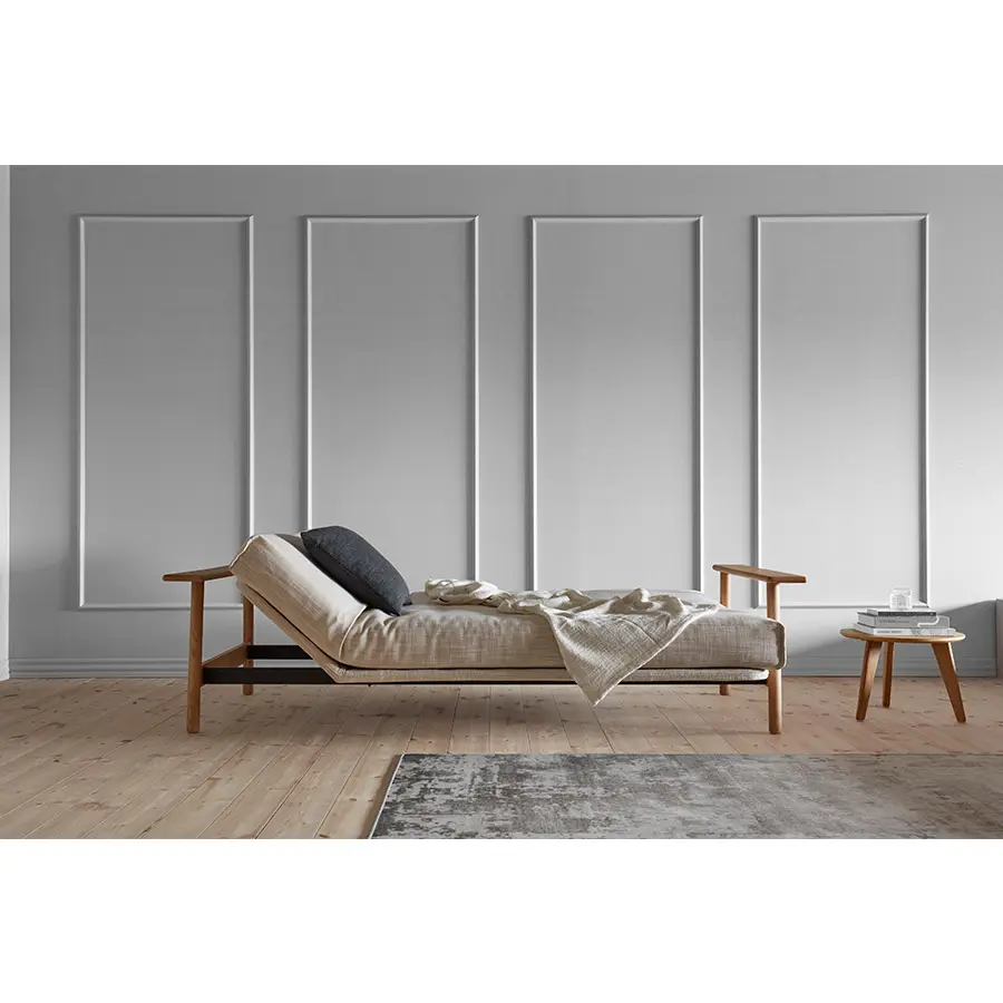 El sofa cama Balder tiene un diseño único de estilo escandinavo. Cuenta con dos posiciones de sofá reclinables y un reposabrazos de roble macizo. Se convierte en una cama de 140 x 200 con elevación de cabeza de 4 pasos.