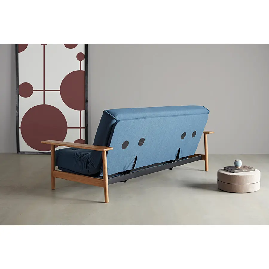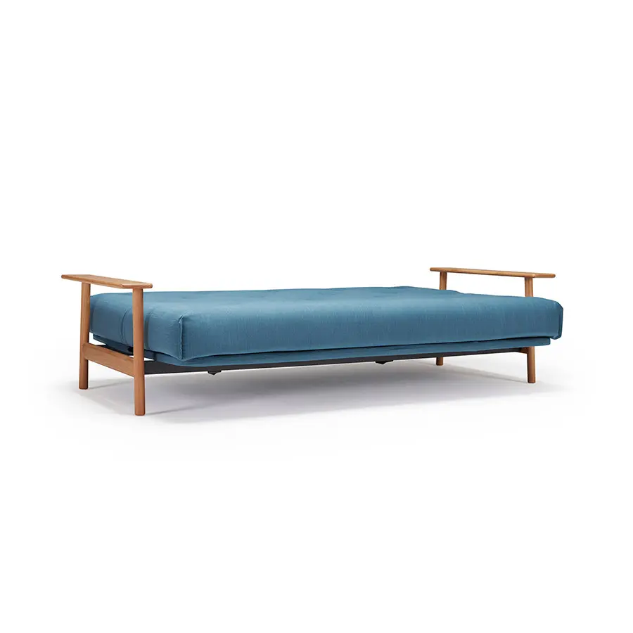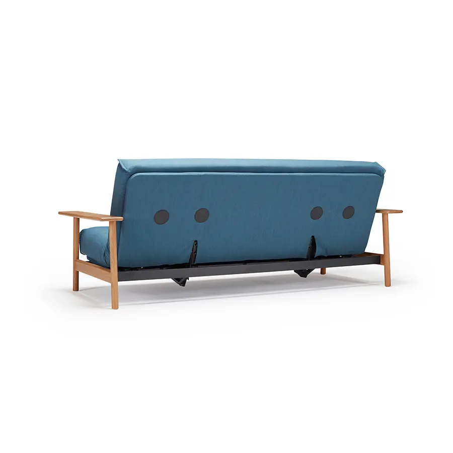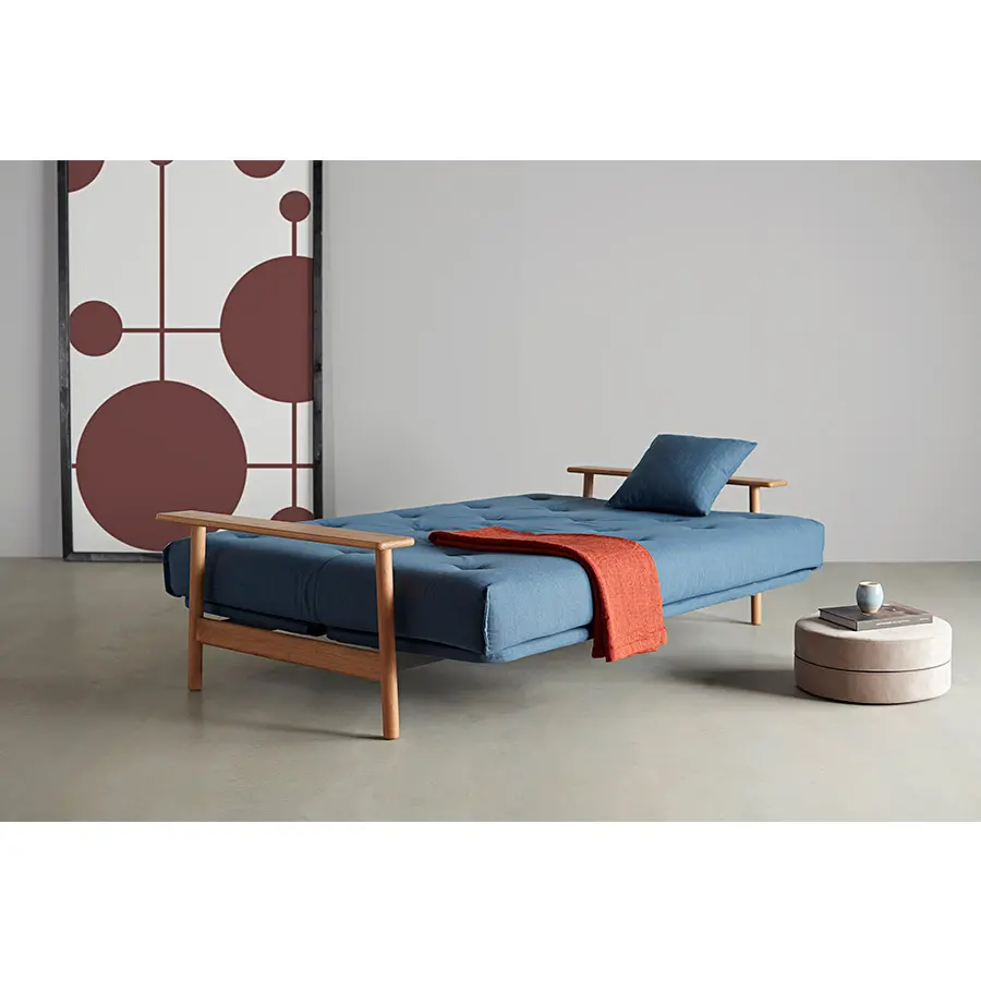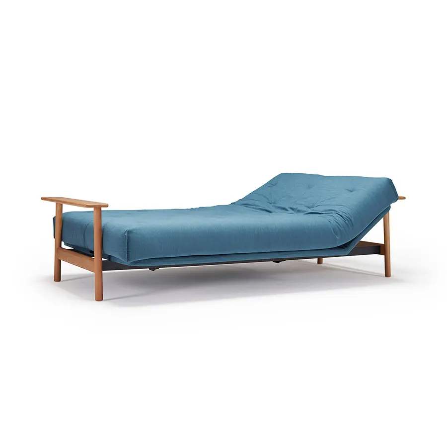 El sofa cama Balder tiene un diseño único de estilo escandinavo. Cuenta con dos posiciones de sofá reclinables y un reposabrazos de roble macizo. Se convierte en una cama de 140 x 200 con elevación de cabeza de 4 pasos.