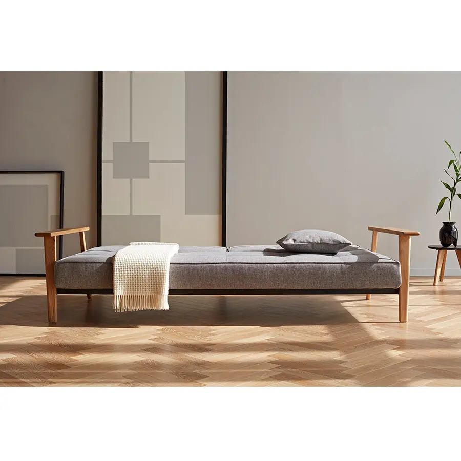 Su estructura es ligera pero resistente, con una base metálica robusta y elegantes patas en madera maciza de roble, que aportan calidez y sofisticación. El colchón con muelles ensacados garantiza un confort superior, tanto en posición de sofá como de cama, y su diseño compacto lo hace perfecto para espacios reducidos que no quieren renunciar al estilo.