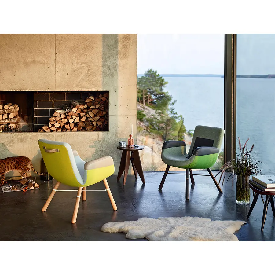 Asiento y base: madera maciza con acabado al aceite en roble natural, núcleo de roble ahumado o nogal americano; elemento de conexión de chapa de acero, con revestimiento al polvo (textura fina) en deep black.