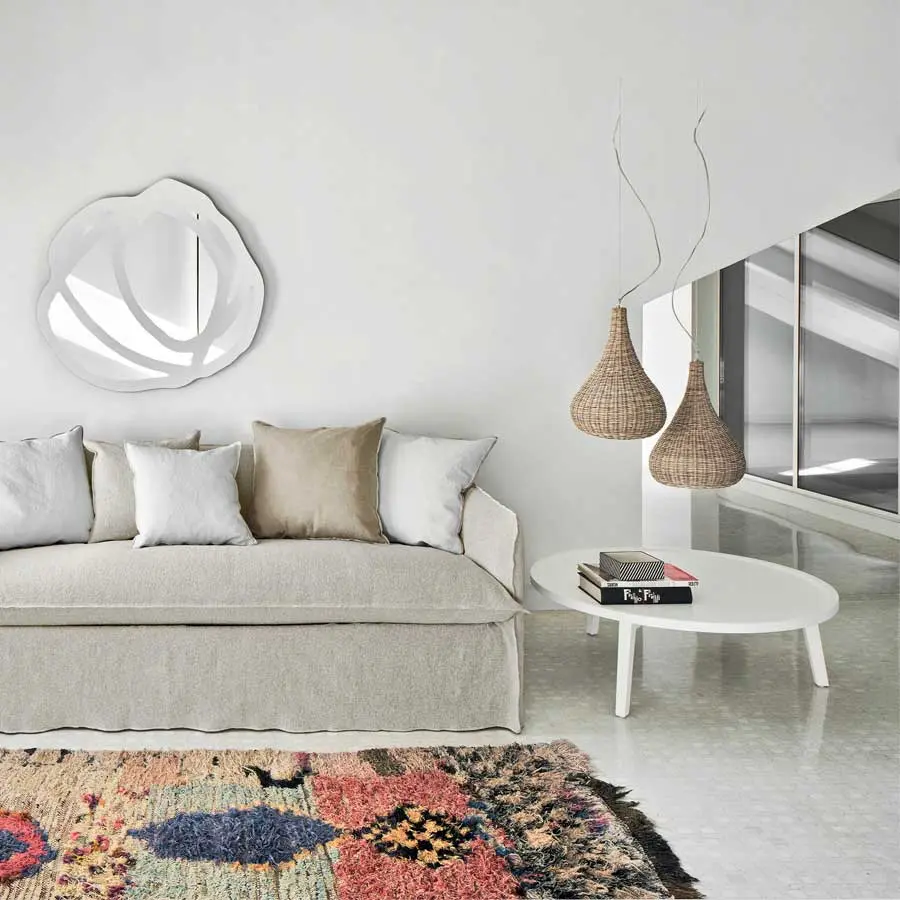 Líneas sinuosas que recuerdan la envolvente forma de un nido caracterizan a la familia de lámparas colgantes SPIN 95/96. La estructura envolvente en forma de gota está realizada completamente en mimbre tejido natural, lacado en blanco mate, gris, océano, tórtola o negro. Es un producto capaz de crear un clima cálido y acogedor gracias a la luz que se filtra a través del entramado de fibra natural.