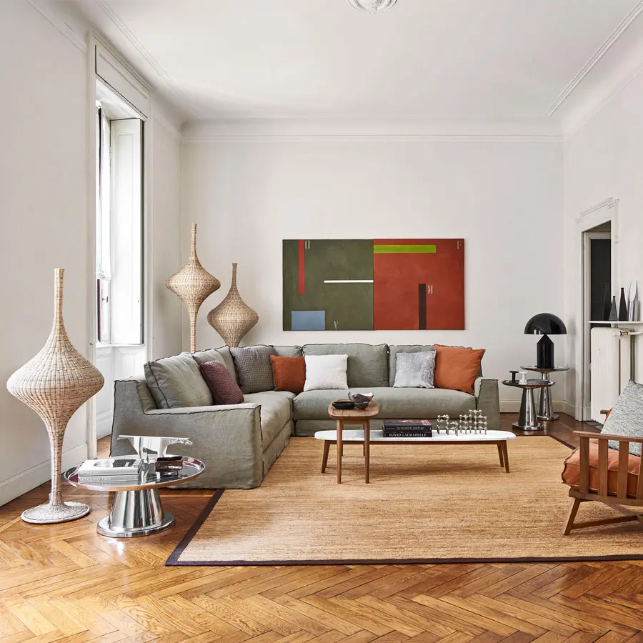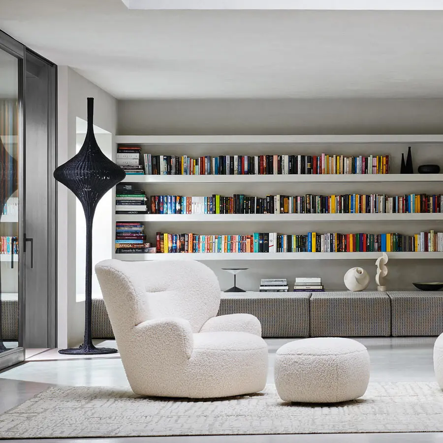 Líneas sinuosas que recuerdan la envolvente forma de un nido caracterizan a la familia de lámparas de pie SPIN S/M/L, disponibles en 3 tamaños diferentes. La estructura envolvente que recuerda al huso de la rueca está realizada completamente en mimbre tejido natural, lacado en blanco mate, gris, océano, tórtola o negro. Es un producto capaz de crear un clima cálido y acogedor gracias a la luz que se filtra a través del entramado de fibra natural.