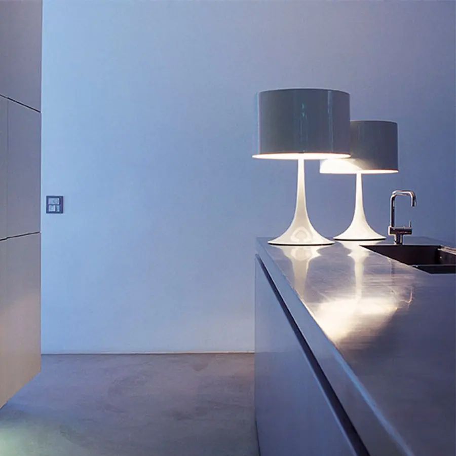 Los intereses de Sebastian Wrong en la pureza, la forma, la función y la honestidad se hacen claramente evidentes en su lámpara de mesa Spun. La pantalla de la lámpara de mesa Spun está cubierta con un difusor de vidrio arenado que funciona para producir una luz suave y difusa. Es ideal como mesa, escritorio o lámpara de noche. Chasis y difusor de metal torneado en chapa, brazos soporte difusor y soporte portalámpara de aleación de aluminio de fundición a presión barnizados en distintos colores. El dimmer electrónico que está en el cable consiente la regulación gradual de la intensidad luminosa. Disponible en distintas alturas, y en formato de suelo.