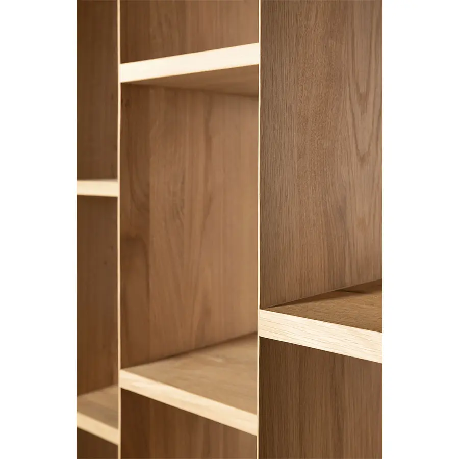 Una composición angular, diseñada por Alain van Havre, forma el corazón de un diseño que tiene como objetivo distanciarse de las superficies estáticas e inmóviles tradicionales. Al alinear múltiples ángulos, se crea una sensación única de volumen. Cuando agregamos luz a la ecuación, el lienzo de roble multifacético crea aún más profundidad al proyectar sombras.