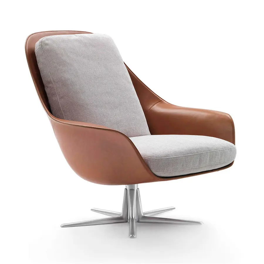 El carácter inconfundible del sillón Sveva se expresa plenamente a través de su elegante silueta, que hace hace presagiar su naturaleza generosa y acogedora. Una sinuosa carcasa hecha de poliuretano estructural rígido y recubierta después de cuero aloja los suaves cojines del asiento y del respaldo, acolchados con plumón de ganso. La base giratoria está fabricada en aluminio fundido a presión y está disponible en versiones de cuatro o cinco radios, esta última diseñada específicamente para satisfacer las necesidades del sector de la hostelería.