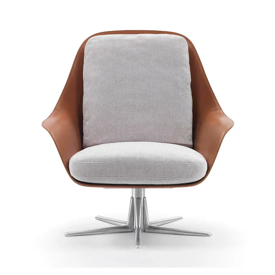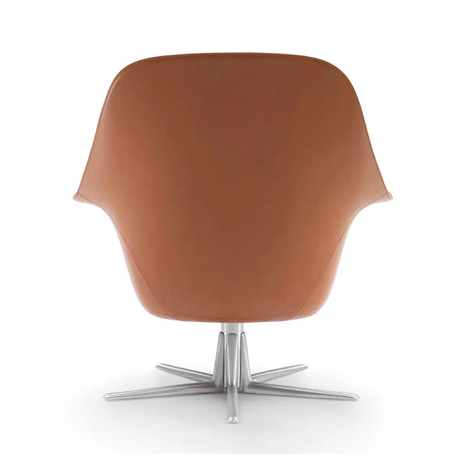 El carácter inconfundible del sillón Sveva se expresa plenamente a través de su elegante silueta, que hace hace presagiar su naturaleza generosa y acogedora. Una sinuosa carcasa hecha de poliuretano estructural rígido y recubierta después de cuero aloja los suaves cojines del asiento y del respaldo, acolchados con plumón de ganso. La base giratoria está fabricada en aluminio fundido a presión y está disponible en versiones de cuatro o cinco radios, esta última diseñada específicamente para satisfacer las necesidades del sector de la hostelería.