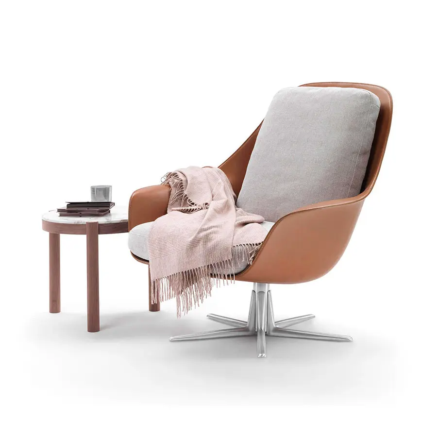 Los acabados propuestos para la base son: metal satinado, cromado, bruñido, cromo negro y champán. Son innumerables las combinaciones que se pueden crear entre la carcasa de piel, disponible en nueve colores, y la tapicería de los cojines, que se pueden realizar con todos los tejidos y pieles de la exclusiva colección Flexform. El sillón Sveva puede ir acompañado del reposapiés del mismo nombre.
