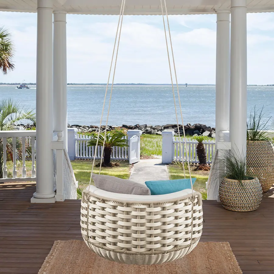 El sillón individual SwingMe y el sofá para dos SwingUs, a pesar de ser significativamente más pequeños que el SWINGREST original, comparten algunas de sus características más distintivas, como la trama extra-anchas de fibra DEDON tejidas a través de sus marcos de aluminio con forma de cesta. El diáfano dosel, disponible como accesorio, confiere a ambas piezas la lujosa intimidad de los pequeños espacios.