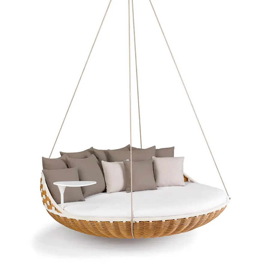 Aunque comparte la mitad de su nombre y gran parte de su estructura tipo cesto con el emblemático NESTREST de DEDON, la creación de Daniel Pouzet, SWINGREST, es única en su clase. Desde su tablero rotatorio hasta su elegante sistema de suspensión, SWINGREST es el sistema definitivo de hanging sofa, perfecto para colgar en una terraza o una galería, o incluso en interiores.