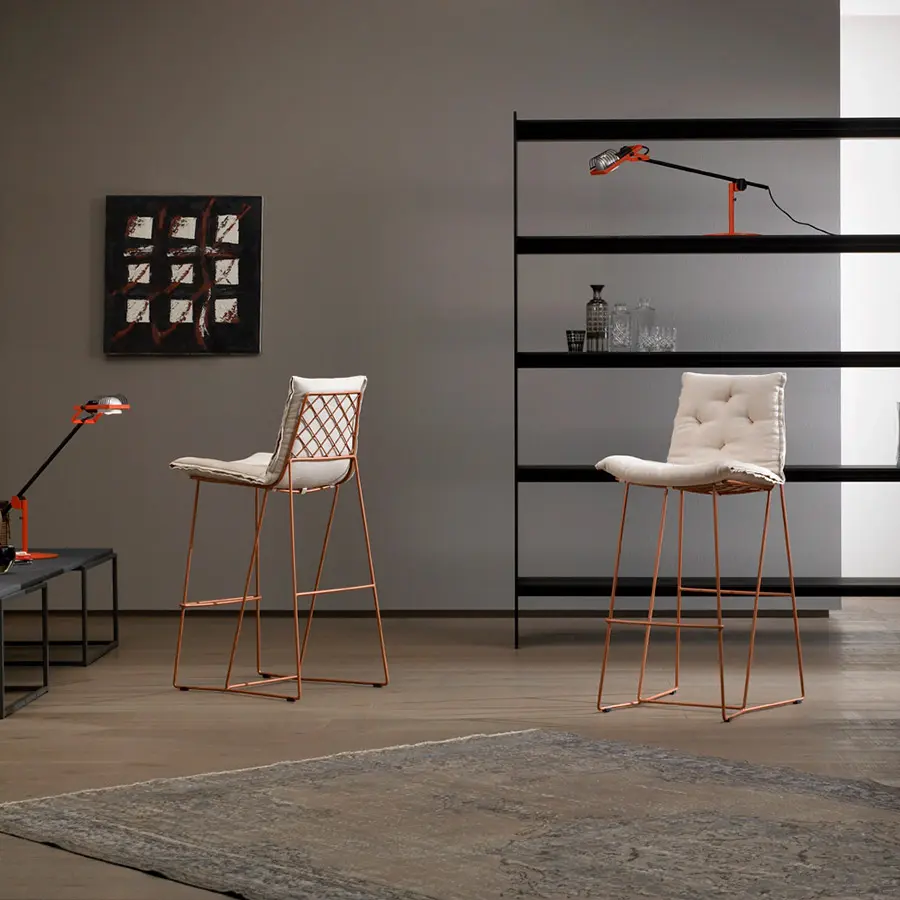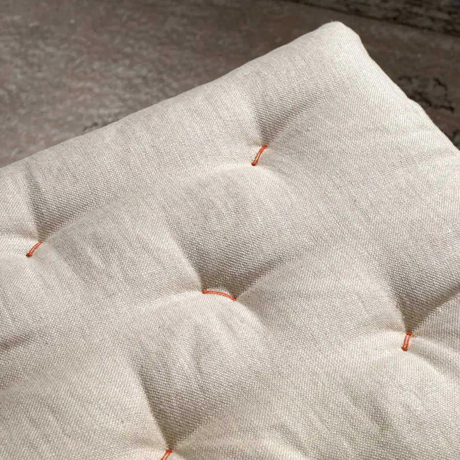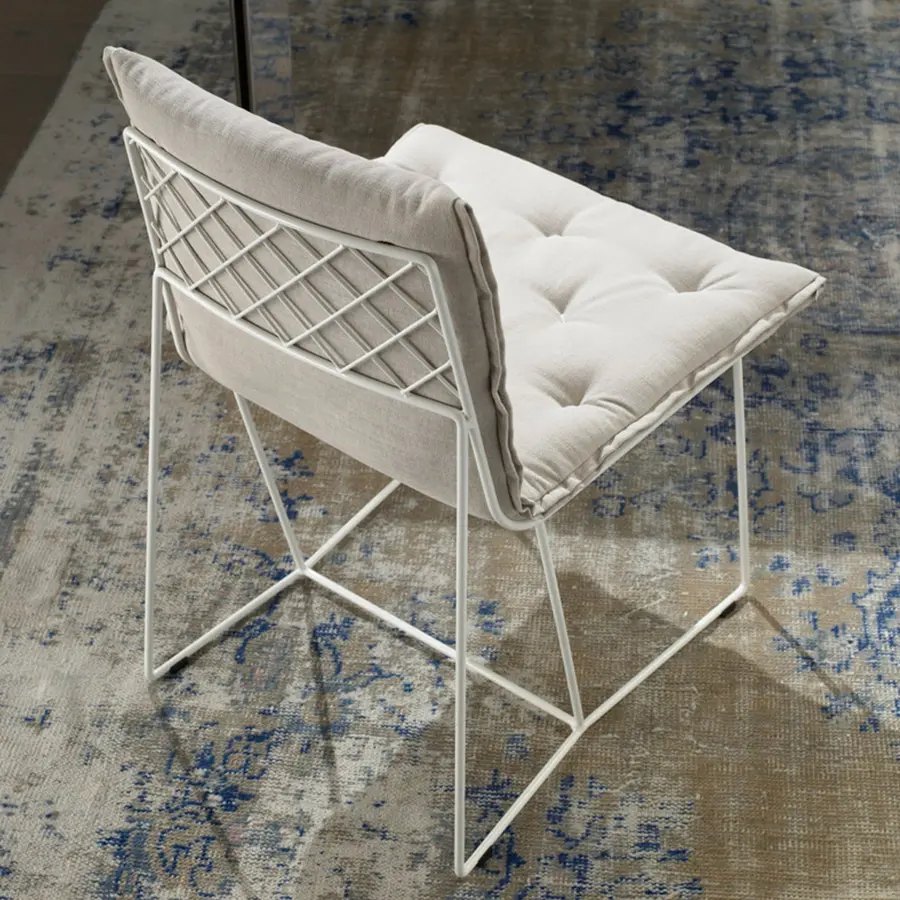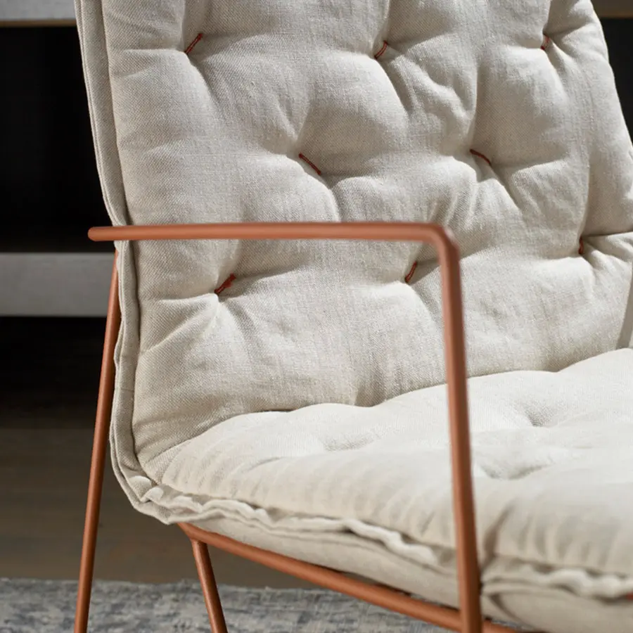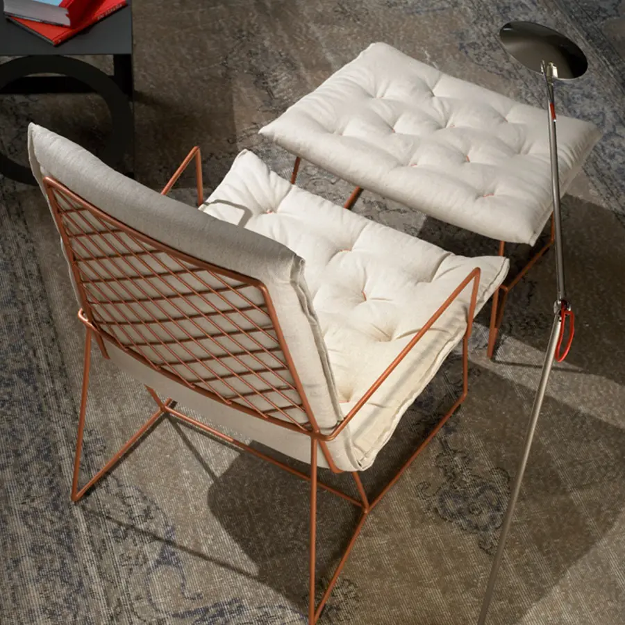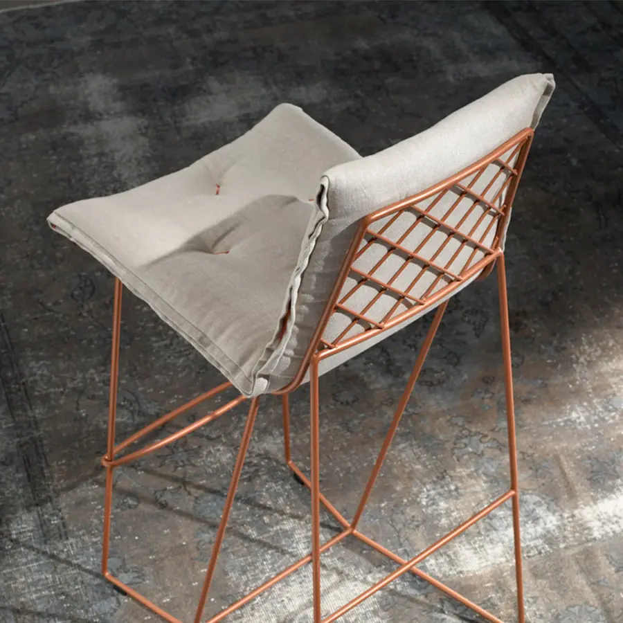 Estructura de varilla de hierro maciza pintada al horno. Colchoneta en espuma de poliuretano de alta resilencia. Funda de tela totalmente desenfundable. Colores disponibles: cobre, blanco y gris oscuro. Dispone de tacos deslizantes e polipropileno.
