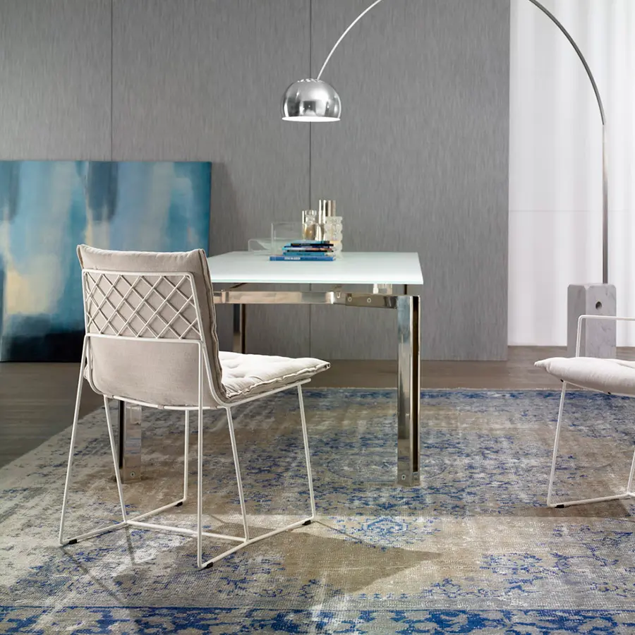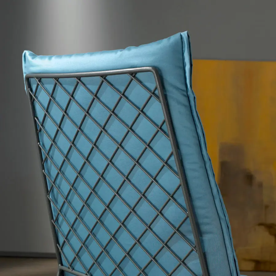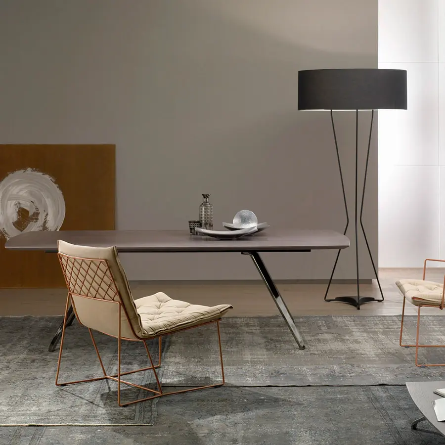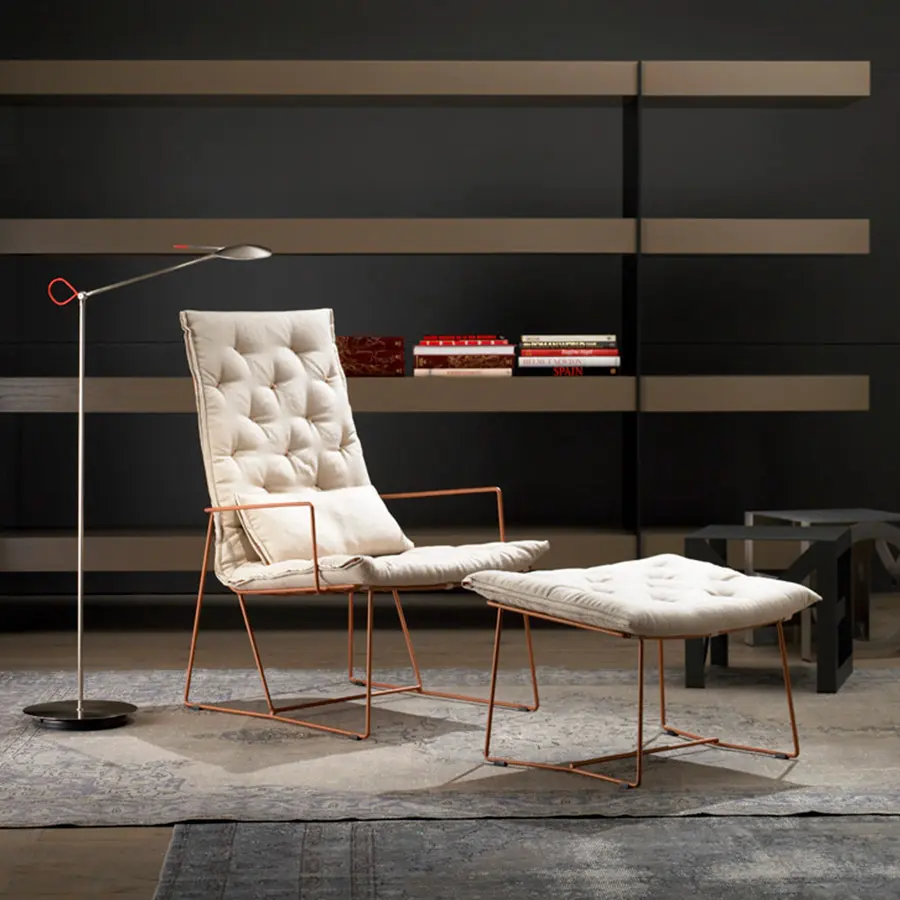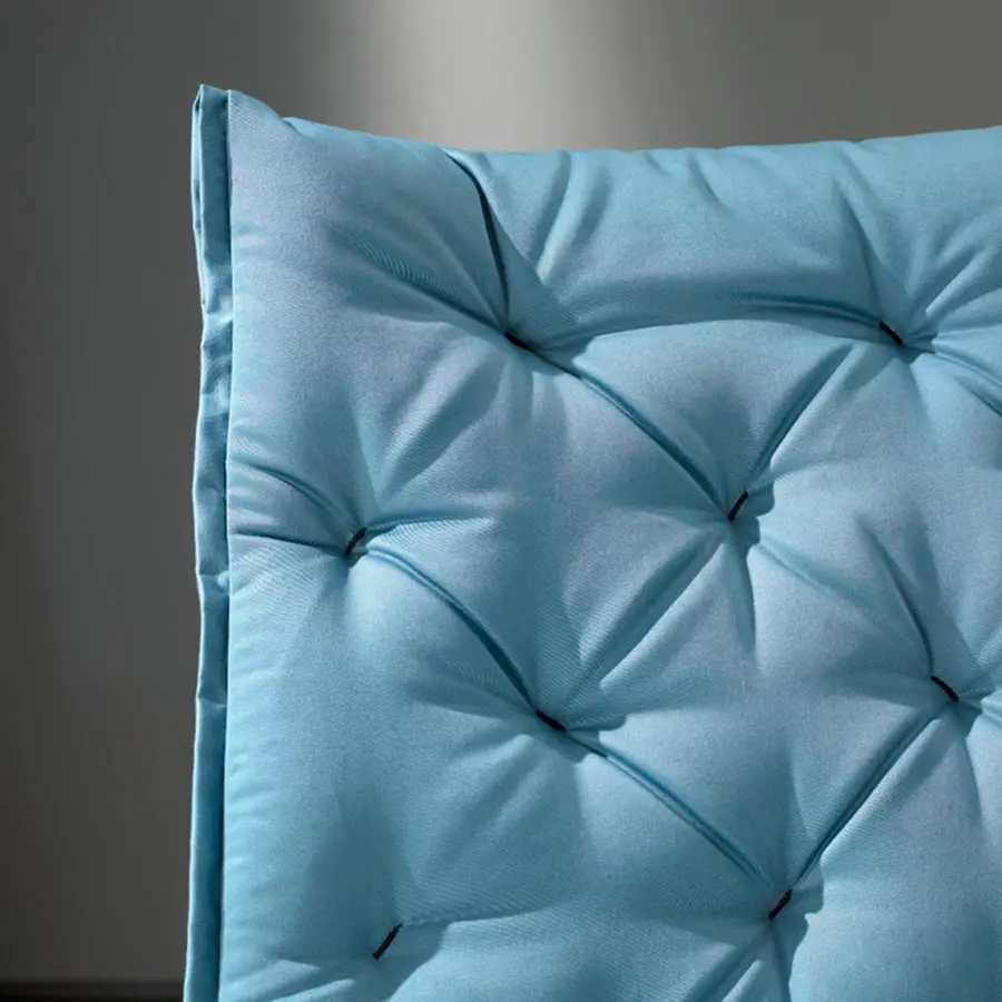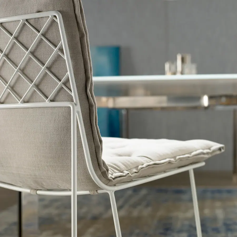 Estructura de varilla de hierro maciza pintada al horno. Colchoneta en espuma de poliuretano de alta resilencia. Funda de tela totalmente desenfundable. Colores disponibles: cobre, blanco y gris oscuro. Dispone de tacos deslizantes e polipropileno.
