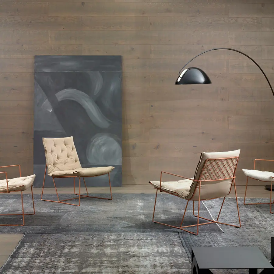 La colección Syrma, parte de la idea de conseguir un producto muy ligero visivamente mediante la combinación de muchos alambres entrelazados entre si. Dicho efecto, se consigue mediante una malla metálica y un perímetro de varilla que definen así su contorno. Para lograr la comodidad de la misma se dispone de una colchoneta capitoneada fijada a la maya. Disponible en tres colores (cobre, blanco y gris oscuro) se combinan el despunte del capitoné y la cremallera lateral con el color de la estructura. La colección dispone de silla, butaca, butaca alta, taburete y puf.