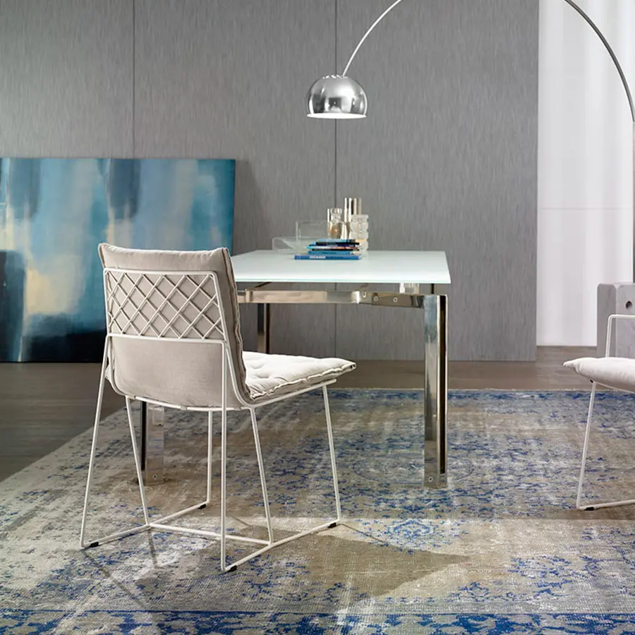 Estructura en varilla de hierro maciza pitada al horno. Colchoneta en espuma de poliuretano de alta resilencia. Funda de tela totalmente desenfundable. Colores disponibles: cobre, blanco y gris oscuro. Dispone de tacos deslizantes de polipropileno.