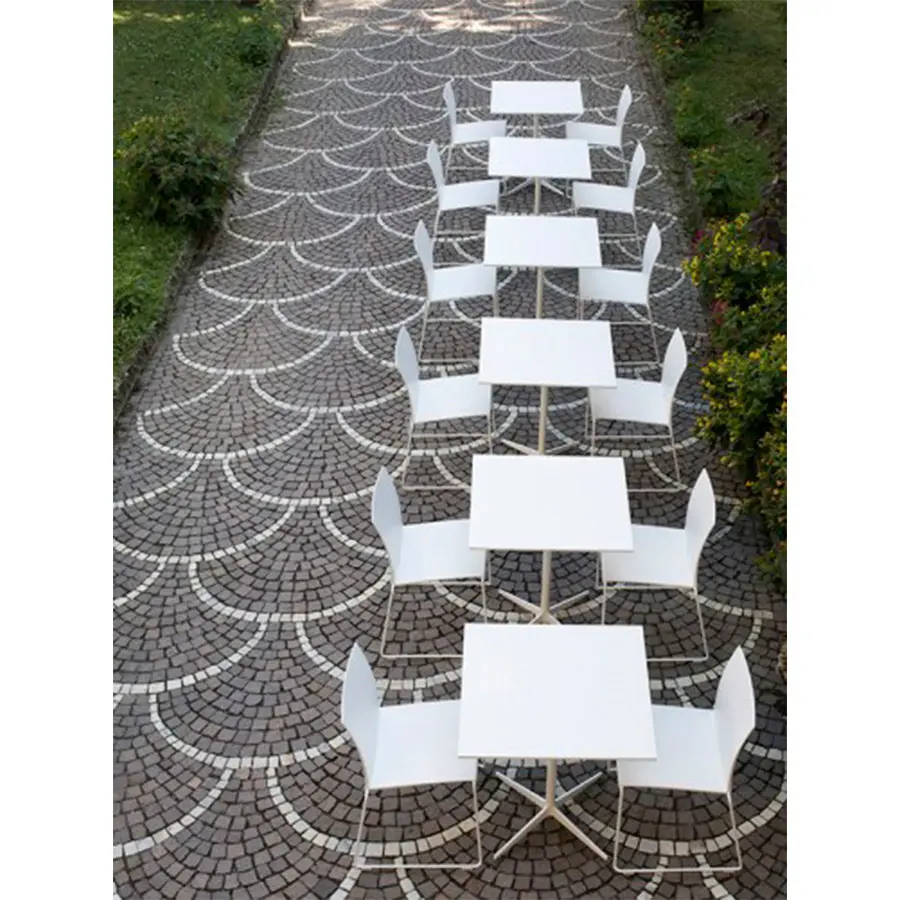 Una mesa de café con una pata central caracterizada por la continuidad cromática de la parte superior y el marco. Marco: con una pata central de acero y una base de estrella de 4 puntos de aluminio fundido pintado en blanco mate o gris grafito.