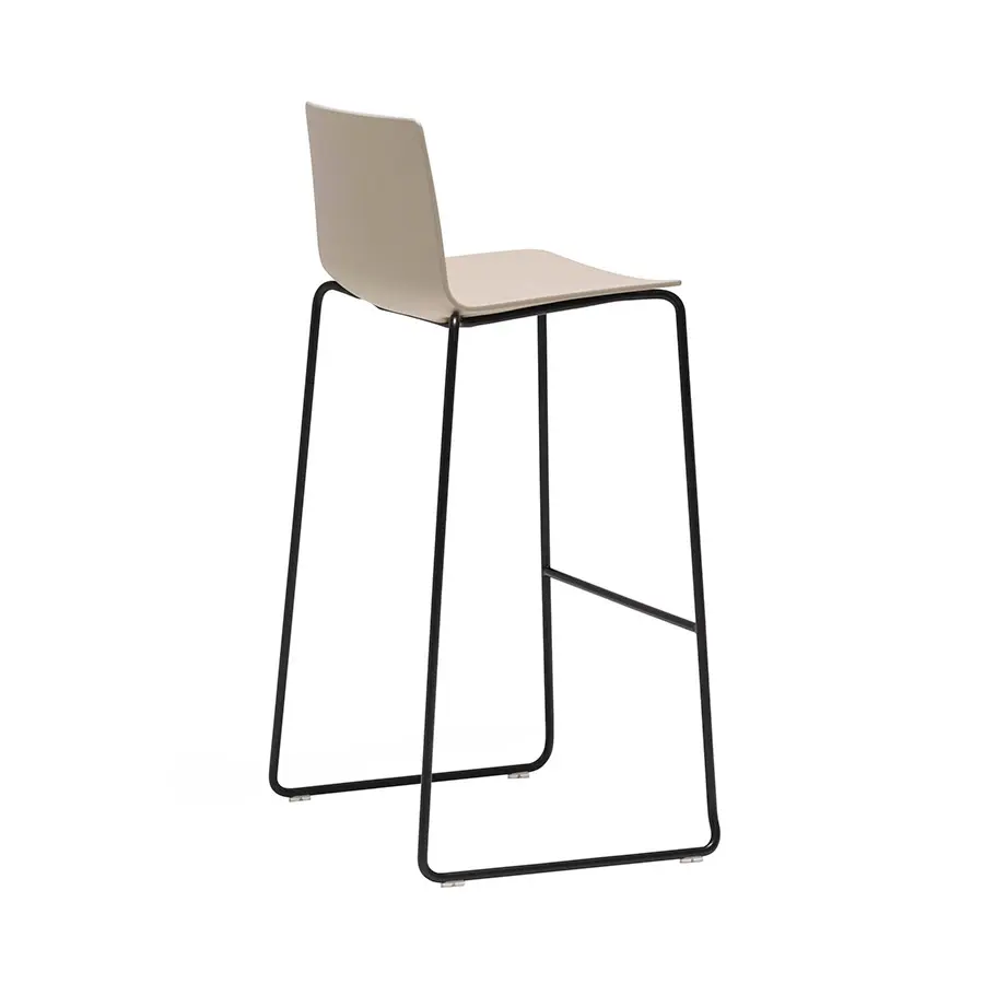 Taburete apilable con patín de acero y acabado en cromo pulido, blanco o negro. Asiento y respaldo termopoliméricos disponibles en varios colores. Carcasa opcional totalmente tapizada o costuras de tapicería paralelas. Asiento tapizado opcional. La versión tapizada incluye un protector de apilamiento.