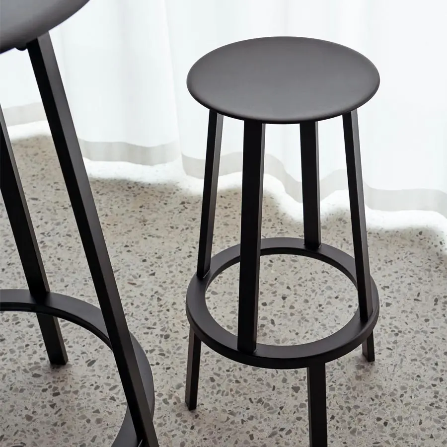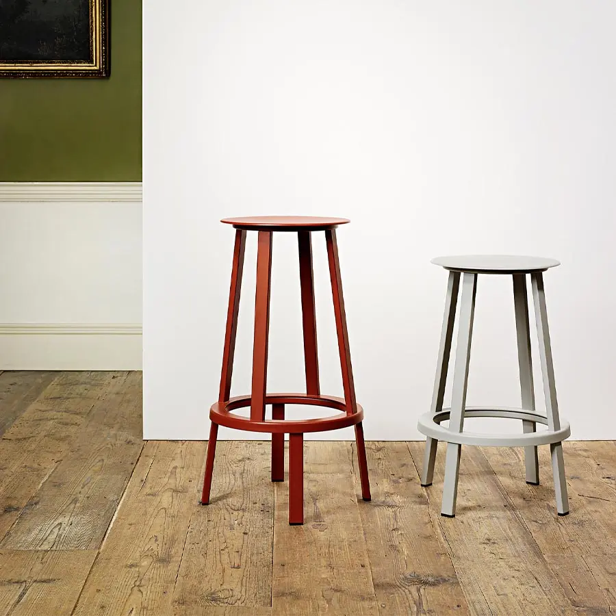 El taburete giratorio Revolver de HAY está colocado sobre un mecanismo de soporte que permite que el asiento y el anillo para los pies giren 360 grados. El asiento delgado y ligeramente abombado presenta bordes curvos para mayor comodidad, mientras que el reposapiés brinda soporte y la base pesada crea una estabilidad total. La función giratoria, aunque altera la apariencia, también aporta una sensación de juego a este diseño funcional. Disponible en dos alturas y una variedad de revestimientos, su presencia versátil lo hace adecuado para una amplia gama de entornos públicos y residenciales.