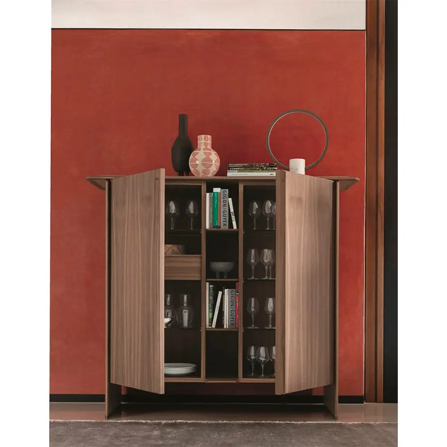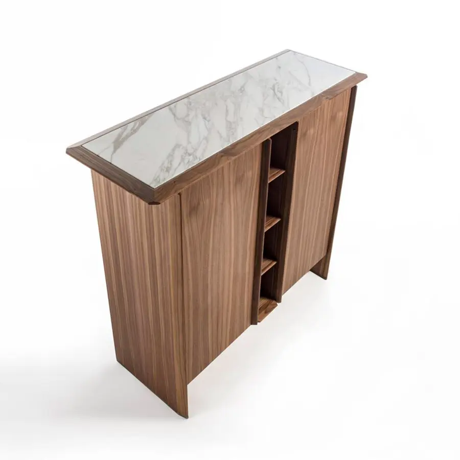 Aparador en nogal canaletta con bordes de madera maciza y tapa de madera, de mármol o de Rock. Equipado con dos compartimientos con puerta. En el compartimiento de la izquierda están un cajón con dos repisas de cristal transparente, mientras que en el de derecha están tres repisas de cristal transparente. Compartimiento central abierto con dos repisas de madera. Laterales con pies en latón bronceado cepillado. 164x56x145