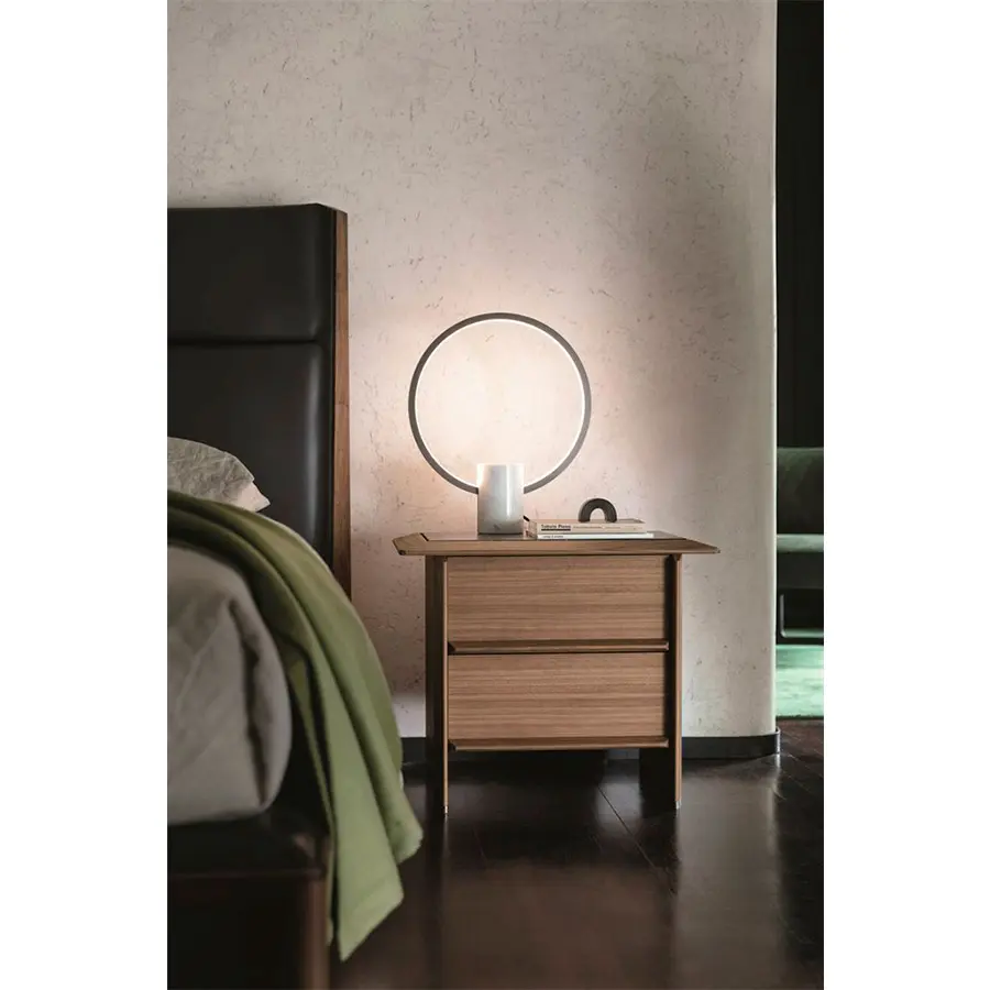 Mesa de noche de dos cajones con bordes de madera maciza y tapa de madera, de mármol o de Rock. Laterales con pies en latón bronceado cepillado.